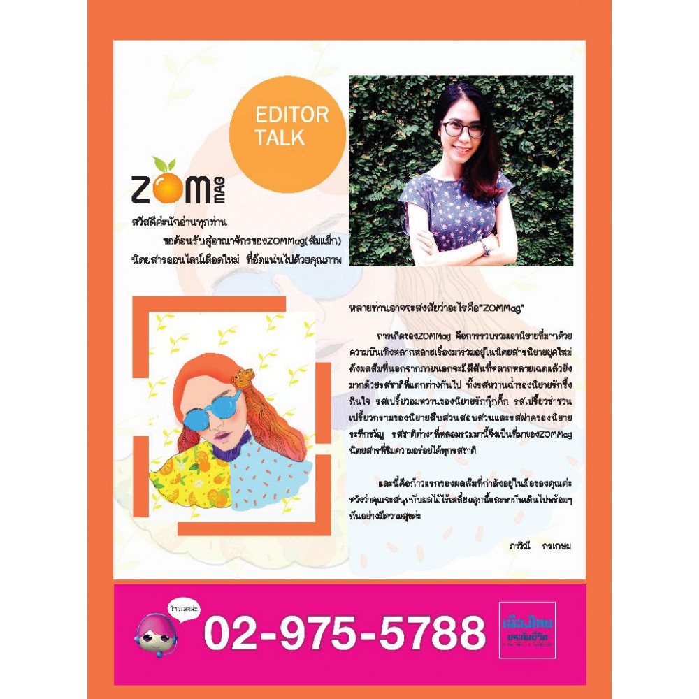 ZOMMag นิตยสารนิยายออนไลน์ยุคใหม่หลากหลายรสชาติมีตั้งแต่รสหวานฉ่ำของนิยายรักซึ้งกินใจ รสเปรี้ยวอมหวานของนิยายรักกุ๊กกิ๊ก และรสเปรี้ยวซ่าชวนเปรี๊ยวกรามของนิยายสืบสวน ไม่ว่าจะรสชาติไหน ผลไม้ไรเหลี่ยมลูกนี้ก็พร้อมเสริฟให้ฟินทุกความอร่อยได้แล้ววันนี้ !!Slogan - ZOMMag ผลไม้ไร้เหลี่ยม!! : peoplemedia