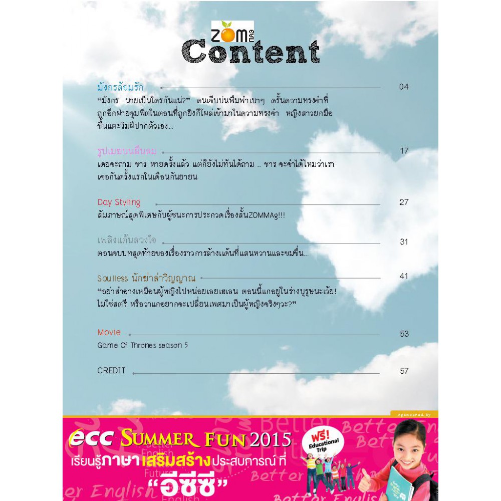 ZOMMag นิตยสารนิยายออนไลน์ยุคใหม่หลากหลายรสชาติมีตั้งแต่รสหวานฉ่ำของนิยายรักซึ้งกินใจ รสเปรี้ยวอมหวานของนิยายรักกุ๊กกิ๊ก และรสเปรี้ยวซ่าชวนเปรี๊ยวกรามของนิยายสืบสวน ไม่ว่าจะรสชาติไหน ผลไม้ไรเหลี่ยมลูกนี้ก็พร้อมเสริฟให้ฟินทุกความอร่อยได้แล้ววันนี้ !!Slogan - ZOMMag ผลไม้ไร้เหลี่ยม!! : peoplemedia