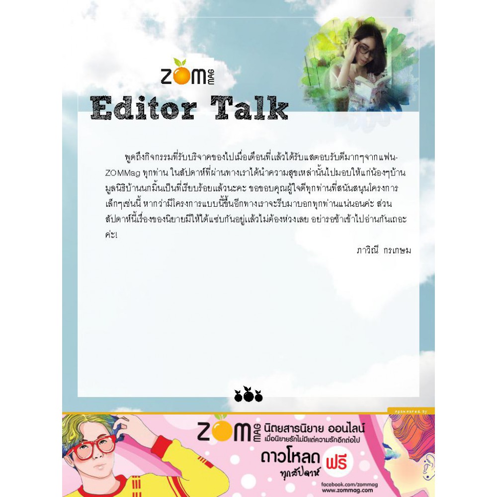 ZOMMag นิตยสารนิยายออนไลน์ยุคใหม่หลากหลายรสชาติมีตั้งแต่รสหวานฉ่ำของนิยายรักซึ้งกินใจ รสเปรี้ยวอมหวานของนิยายรักกุ๊กกิ๊ก และรสเปรี้ยวซ่าชวนเปรี๊ยวกรามของนิยายสืบสวน ไม่ว่าจะรสชาติไหน ผลไม้ไรเหลี่ยมลูกนี้ก็พร้อมเสริฟให้ฟินทุกความอร่อยได้แล้ววันนี้ !!Slogan - ZOMMag ผลไม้ไร้เหลี่ยม!! : peoplemedia