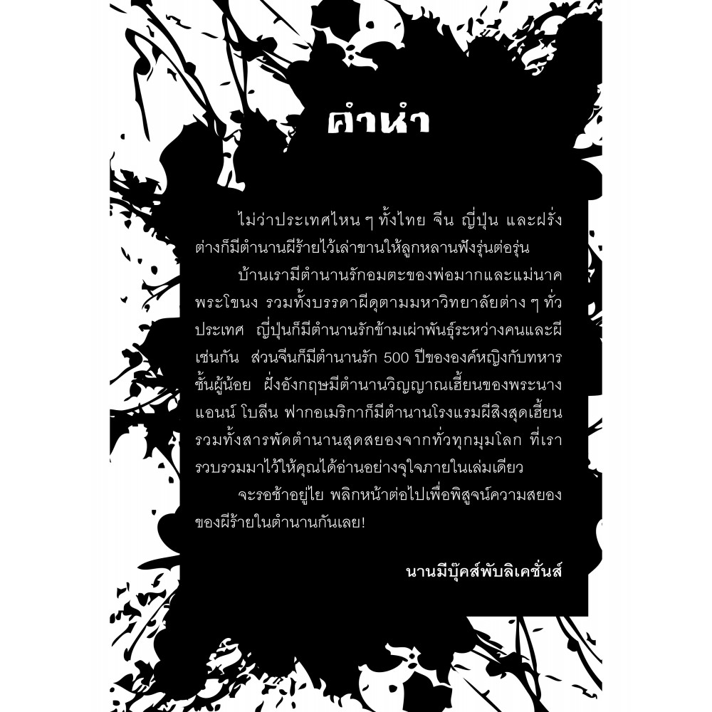 โรงแรมผีสิงที่ดังที่สุดในโลกอยู่ประเทศไหน- เรื่องเล่าที่หลอนที่สุดในอเมริกาคือเรื่องใด- ตำนานคำสาปอีกาเกี่ยวข้องกับราชวงศ์อังกฤษอย่างไร- ผีญี่ปุ่นแต่งงานและมีลูกกับคนได้ด้วยหรือ- ตำนานสุดสยองของผีไทยในมหาวิทยาลัยต่างๆเฮี้ยนแค่ไหนหาคำตอบได้ในหนังสือเล่มนี