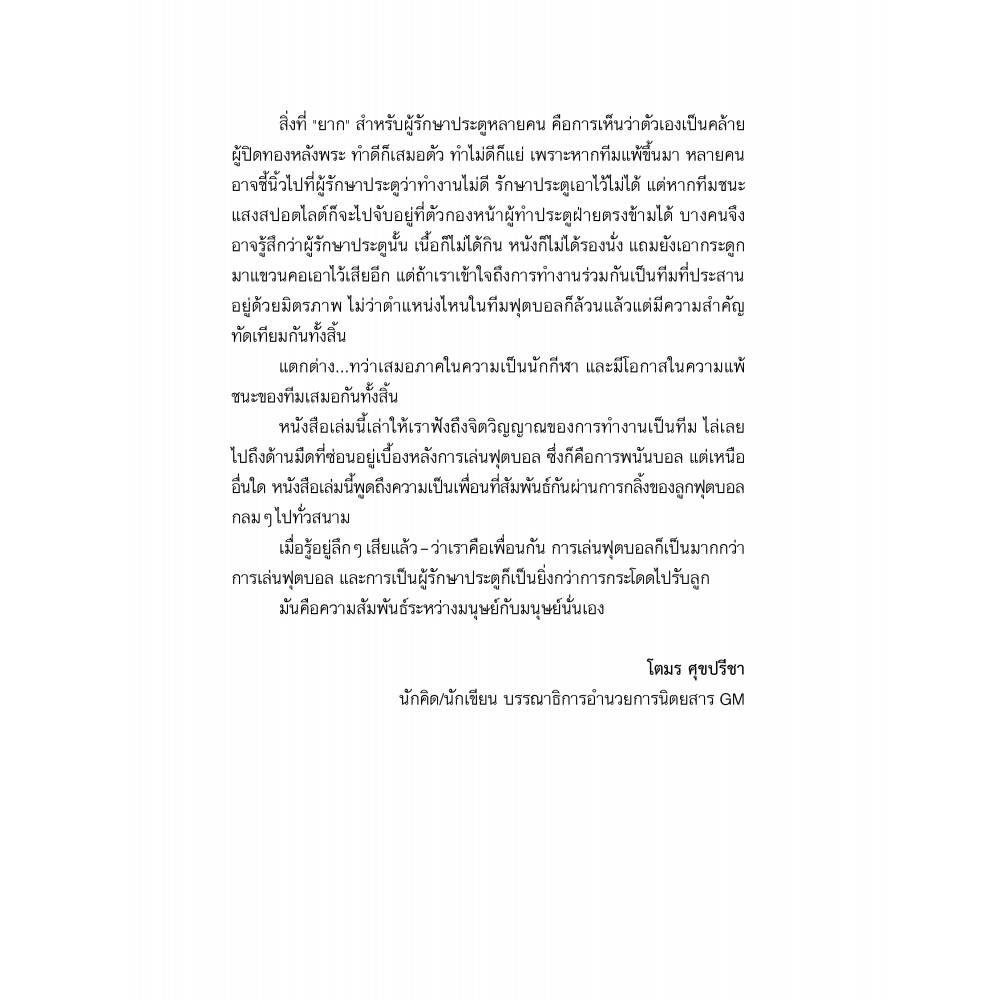 ตีแผ่ประสบการณ์การแข่งขันฟุตบอลจากใจผู้รักษาประตูมือกาวซึ่งคุณอาจไม่เคยรู้อย่างถึงแก่น ดุ เด็ด เผ็ด มัน ลึกเร้น กะเทาะกฎ กติกา มารยาททั้งในและนอกสนาม แถมสั่นสะท้านไปถึงหลังบ้านวงการฟุตบอลที่ต้องอึ้ง เขียนโดยผู้รักษาประตูตัวจริงร่วม 10 ปี ในทีมฟุตบอลคณะของ