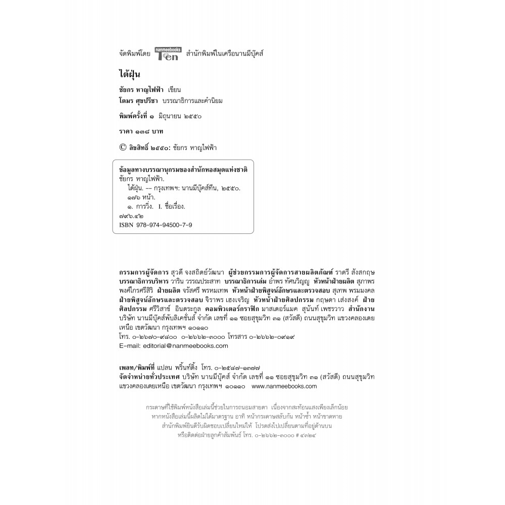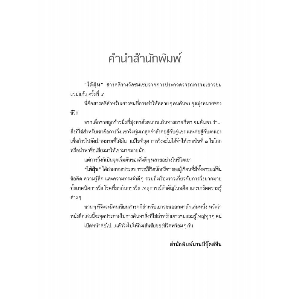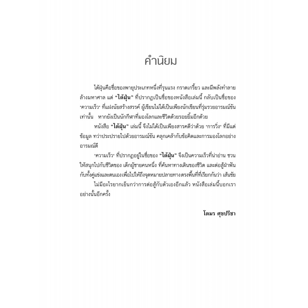 ‘ไต่ฝุ่น’ สารคดีการวิ่งที่ไม่จืดชืดหรือเครียดขรึม ถ่ายทอดข้อมูล เทคนิค และเกร็ดความรู้เกี่ยวกับการวิ่งผ่านชีวิตของเด็กชายชาวเหนือผู้หลงใหลในกีฬาคนหนึ่ง (ผู้เขียนเอง) ที่มุ่งมั่นค้นหาทางเดินให้กับชีวิตของตัวเอง หลังจากที่ลองเล่นกีฬามาหลายประเภท ในที่สุดเขาก็รู้ว่าตัวเองเหมาะกับการวิ่งที่สุด ‘ไต้ฝุ่น’ เป็นสารคดีที่อ่านสนุก เพราะไม่ได้อัดแน่นไปด้วยข้อมูลความรู้เพียงอย่างเดียว แต่ยังสอดแทรกความรู้สึกดีๆ และอารมณ์ขันของผู้เขียนซึ่งเป็นคนในแวดวงการวิ่งมาตั้งแต่เด็ก : Nanmeeboo