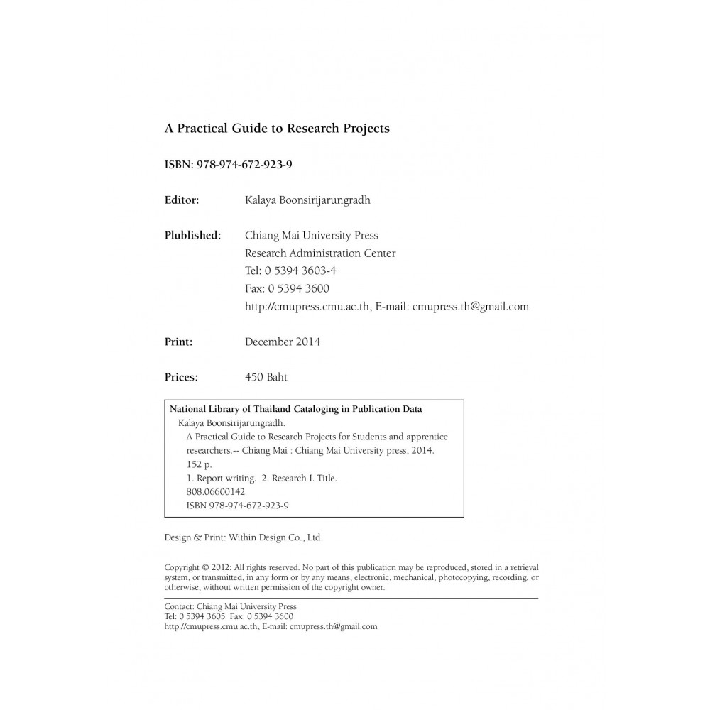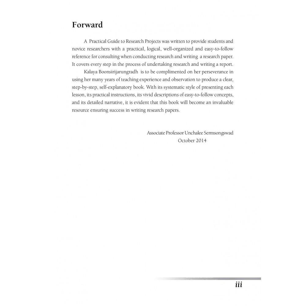 A Practical Guide to Research Projects is a self-explanatory book that aims to help university students, especially English majors or international program students, who have to write a research report in English. The book provides the basic knowledge on how to complete a research project, including the research process, step-by-step, and suggestions on how to write the five chapters of a research report using the appropriate language patterns. All descriptions and explanations are transparent, with easy-to-follow concepts.