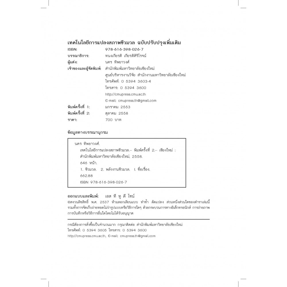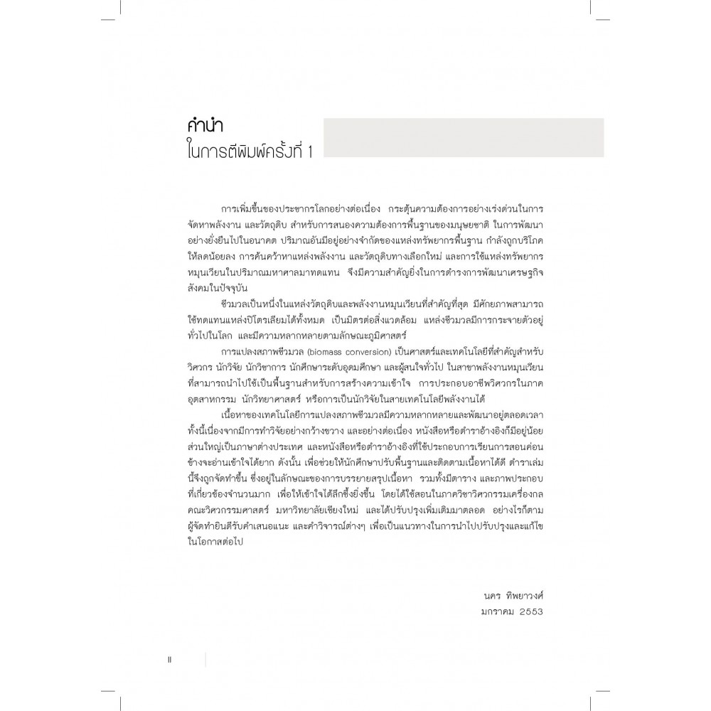 การแปลงสภาพชีวมวล การแปลงสภาพชีวมวลเพื่อประโยชน์ทางพลังงานและวัสดุภัณฑ์เป็นศาสตร์และเทคโนโลยีที่สำคัญในสาขาพลังงานหมุนเวียนเหมาะสำหรับวิศวกร นักวิจัย นักวิชาการ นักศึกษาระดับอุดมศึกษา และผู้สนใจทั่วไป ใช้ในการเรียนการสอน การวิจัยเป็นพื้นฐานความรู้ ในการอ้างอิง และการนำไปปฎิบัติได้จริง