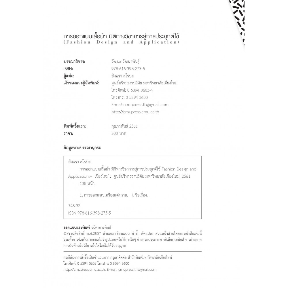 หนังสือการออกแบบเสื้อผ้า : มิติทางวิชาการสู่การประยุกต์ใช้ เป็นหนังสือเชิงวิชาการเพื่อนำเสนอให้เห็นพัฒนาการของแฟชั่นมีรายละเอียดเกี่ยวกับประวัติความเป็นมาของแฟชั่นความรู้พื้นฐานด้านการออกแบบเสื้อผ้า หลักการออกแบบเสื้อผ้าเป็นขั้นตอนที่ผู้อ่านสามารถอ่านแล้วเข้าใจง่าย ซึ่งผู้เขียนได้เรียบเรียงจากหนังสือทั้งในประเทศและต่างประเทศอีกทั้งยังมีเทคนิคขั้นตอนของการวาดหุ่นแบบง่ายซึ่งผู้เขียนได้ค้นหาวิธีการวาดจากประสบการณ์ที่ฝึกปฎิบัติทดลองปรับปรุงให้เป็นสัดส่วนที่เหมาะสมและง่ายสำหรับนักเรียน นักศึกษา บุคคลทั่วไปที่สนใจศิลปะด้านออกแบบเสื้อผ้าสามารถนำไปศึกษาและฝึกใช้ได้ด้วยตนเอง รวมทั้งการนำไปประกอบอาชีพ นอกจากนี้ผู้เขียนได้นำข้อค้นพบจากหนังสือนี้ไปประยุกต์ใช้กับงานวิจัยในชุมชนได้อีกด้วย