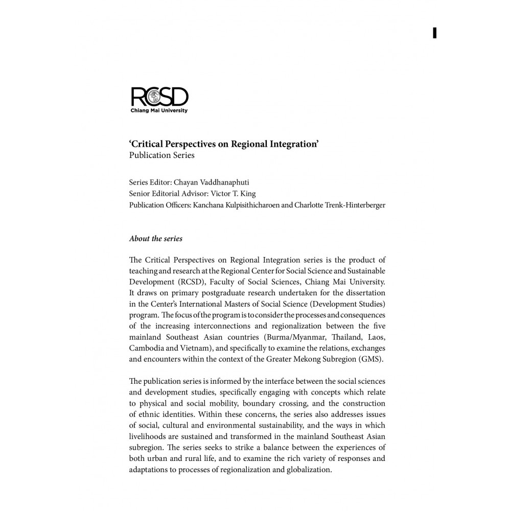 Perceptions and Experiences of the Burmese Nepali Diaspora in Urban Chiang Mai, ThailandMrinalini RaiThis research studies the development of the Burmese-Nepali “Gorkhali” community in urban Chiang Mai, focusing on the cultural orientation they brought from both Burma and Nepal and which they have retained since migrating to ailand. is aspect of the community re ects a diasporic identity that is re ected in the lives of the twice-migrant Nepalis. e interest and focus in this study is the cultural representation of Nepali identity that conceptually situates the Burmese-Nepali as a Nepali diaspora in ailand. e research into the theory of diaspora and the lives of those who are part of one is still ongoing. In this research, Mrinalini Rai examines the narratives and perceptions of the Burmese-Nepalis in Chiang Mai, in order to further develop the notion of diaspora. As a result, contributes to a greater understanding of the complex dynamics and processes that lead to migration, and in particular the dispersion of the Nepalis from Nepal.