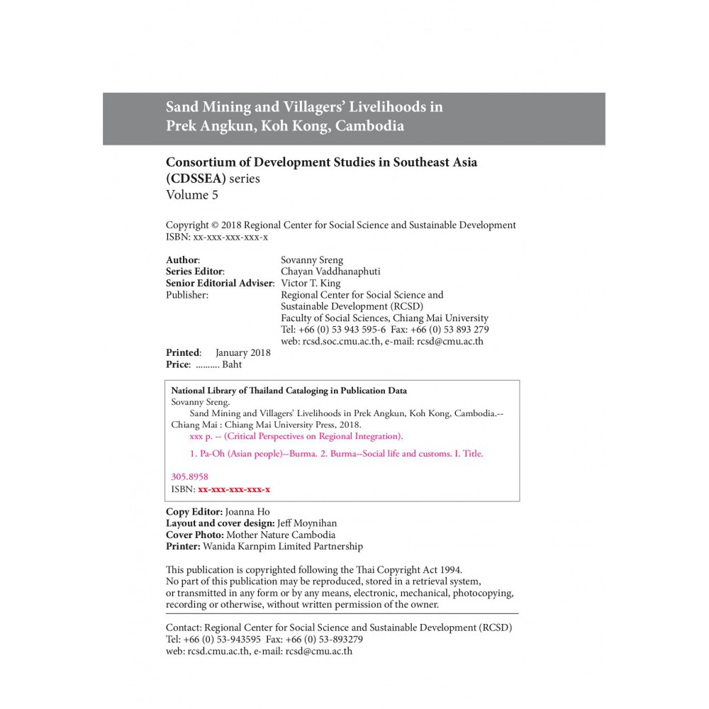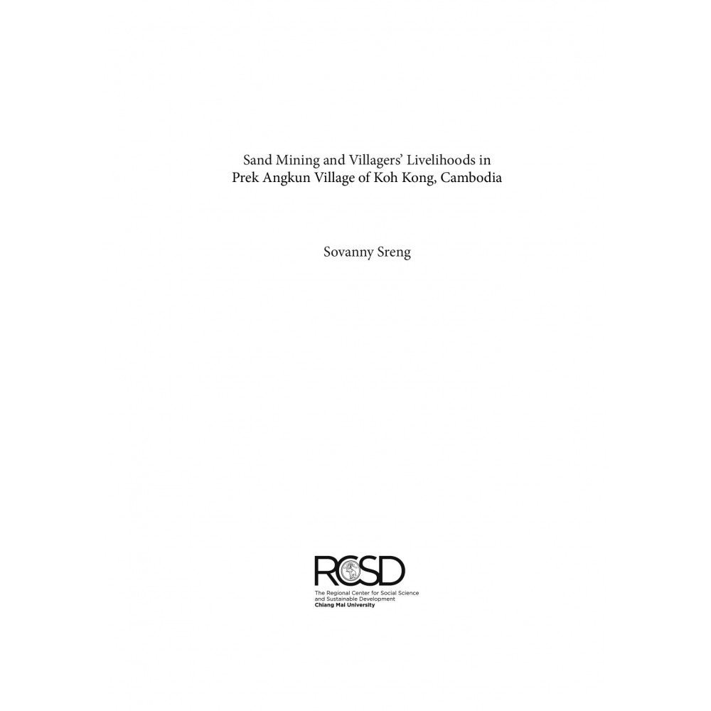 Sand mining has been taking place over the past several yearsacross various parts of Cambodia, especially in the coastal regions. In the southwest region of Cambodia, large areas of natural resources have been damaged, extracted, or replaced. This volume is an attempt to understand the impacts of sand mining on the economic livelihood of villagers in Prek Angkun village of Koh Kong province. The author examined and explored how local villagers have suffered from mining activities and what they have done to counteract those impacts. This study documents villagers' coping strategies, changes to environment and traditions, and loopholes in government legislation that allow sand mining to continue.