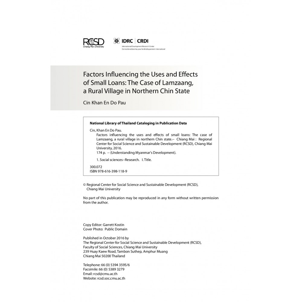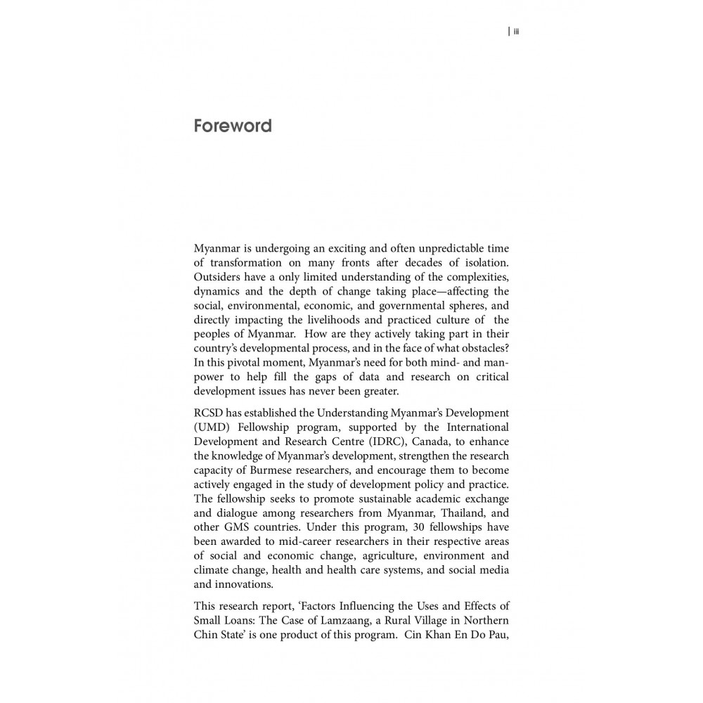 In this ­first volume of the Understanding Myanmar’s Development series, the author Cin Khan En Do Pau (also known as John takes a deep and methodical look into micro­finance in the community of Lamzaang village. ‑Through careful analysis of the entire process of debt-taking and the provision of small scale loans, John penetrates to the heart of the issues and social context in which villagers decide to enter micro­nance schemes and, in the end, how they utilize that capital—for better or for worse