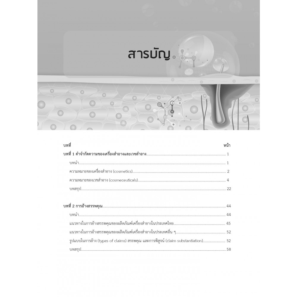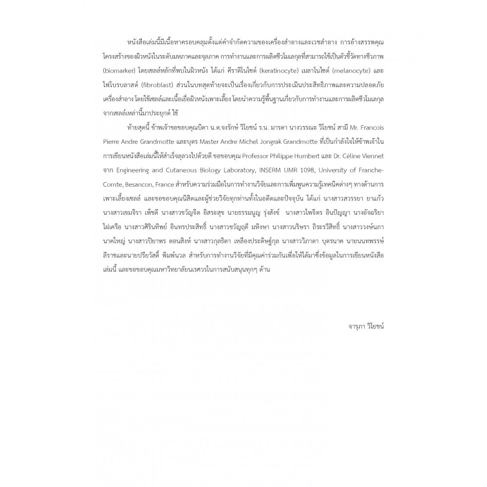 หนังสือเล่มนี้มีเนื้อหาครอบคลุมตั้งแต่คำจำกัดความของเครื่องสำอางและเวชสำอาง การอ้างสรรพคุณโครงสร้างของผิวหนังในระดับมหภาคและจุลภาค-การทำงาน และการผลิตชีวโมเลกุลที่สามารถใช้เป็นตัวชี้วัดทางชีวภาพ (biomarkers) โดยเซลล์หลัก ที่พบในผิวหนัง ได้แก่ คีราติโนไซต์ (keratinocyte) เมลาโนไซต์ (melanocyte) และไฟโบรบลาสต์-(fibroblast)-และการประเมินประสิทธิภาพและความปลอดภัย ผลิตภัณฑ์เครื่องสำอางและเวชสำอางโดยใช้เซลล์และเนื้อเยื่อผิวหนังเพาะเลี้ยง โดยนำความรู้พื้นฐานเกี่ยวกับการทำงานและการผลิตชีวโมเลกุลจากเซลล์เหล่านี้ มาประยุกต์ใช้