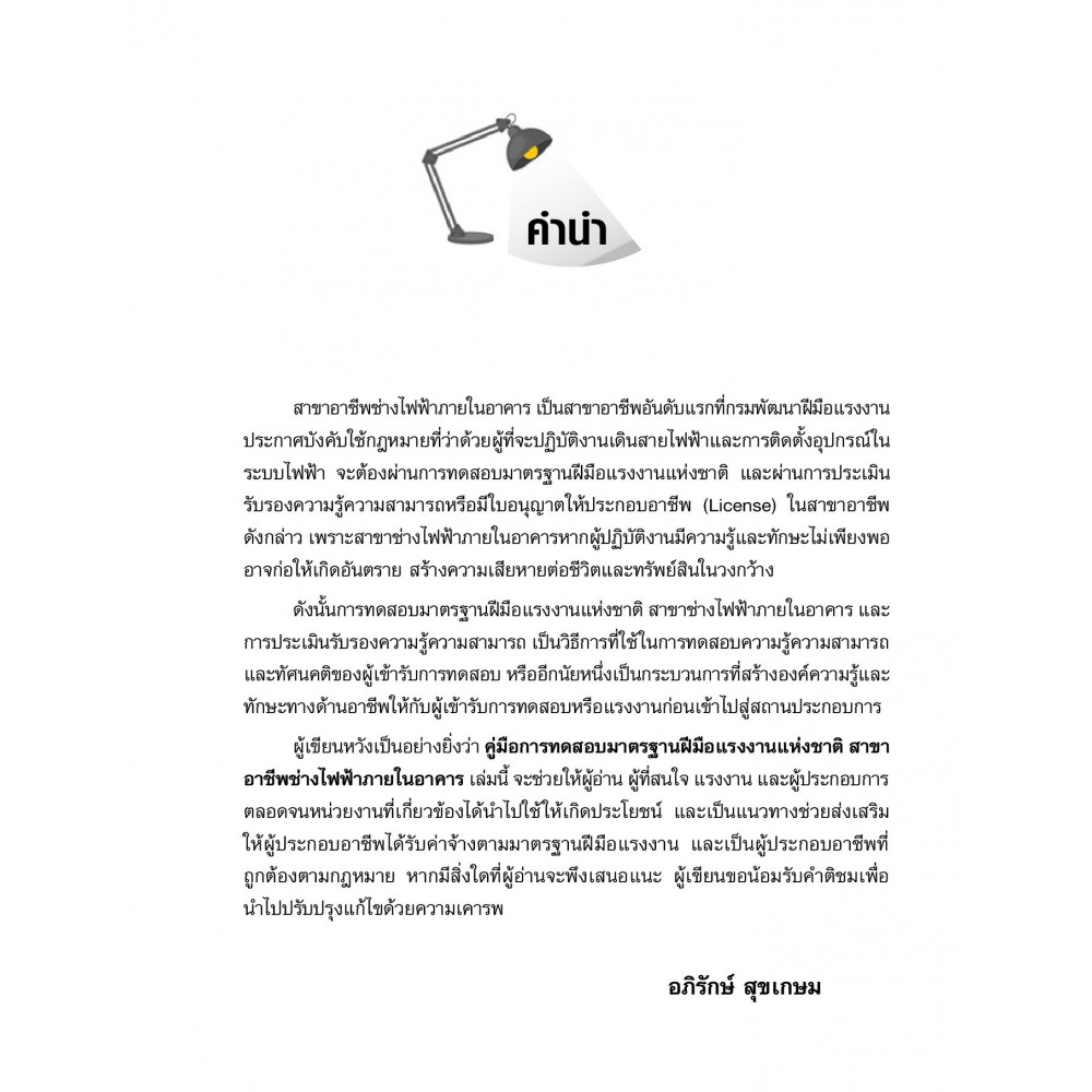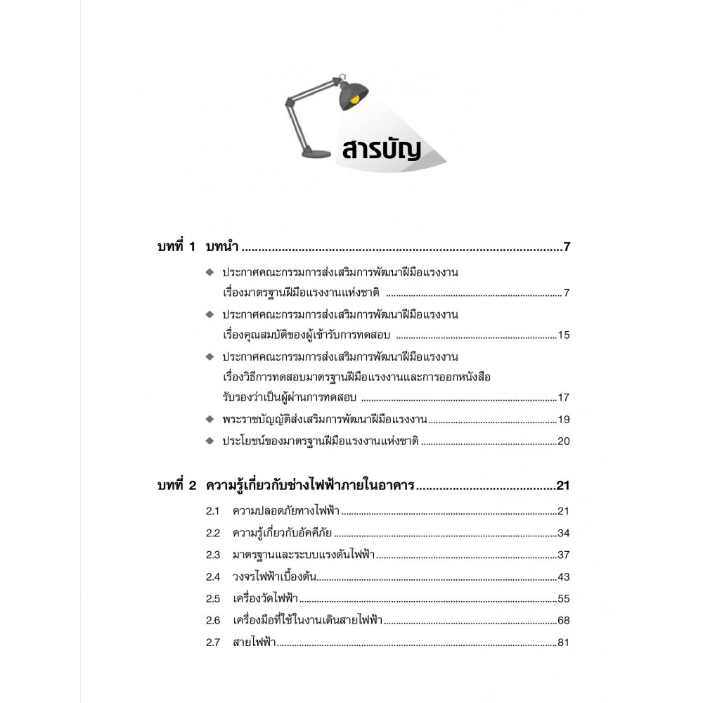 จัดทำขึ้นเพื่อใช้เป็นแนวทางให้กับแรงงานหรือช่างที่ประกอบอาชีพช่างไฟฟ้าภายในอาคาร ซึ่งจะต้องผ่านการทดสอบมาตรฐานฝีมือแรงงานแห่งชาติ สาขาอาชีพช่างไฟฟ้าภายในอาคาร ระดับ 1 โดยเข้ารับการทดสอบภาคความรู้ (ภาคทฤษฎี) และภาคความสามารถ (ภาคปฏิบัติ) แล้วจึงเข้าสู่กระบวนการความรู้ความสามารถ เพื่อให้มีใบรับรองความรู้ความสามารถ หรือใบอนุญาตประกอบอาชีพที่ถูกต้องตามกฏหมาย ทั้งยังเป็นการส่งเสริมให้ผู้ประกอบอาชีพได้รับค่าตอบแทนหรือค่าจ้างตามมาตรฐานฝีมือ เป็นการเตรียมความพร้อมแรงงานก่อนเข้าสู่สถานประกอบการ เนื้อหาภายในเล่มแบ่งออกเป็น 5 ส่วน เริ่มจาก บทนำ ความรู้เกี่ยวกับช่างไฟฟ้าภายในอาคาร การทดสอบภาคความรู้และภาคความสามารถ การขอรับการทดสอบมาตรฐานฝีมือแรงงานแห่งชาติ และการขอรับการประเมินความรู้ความสามารถ