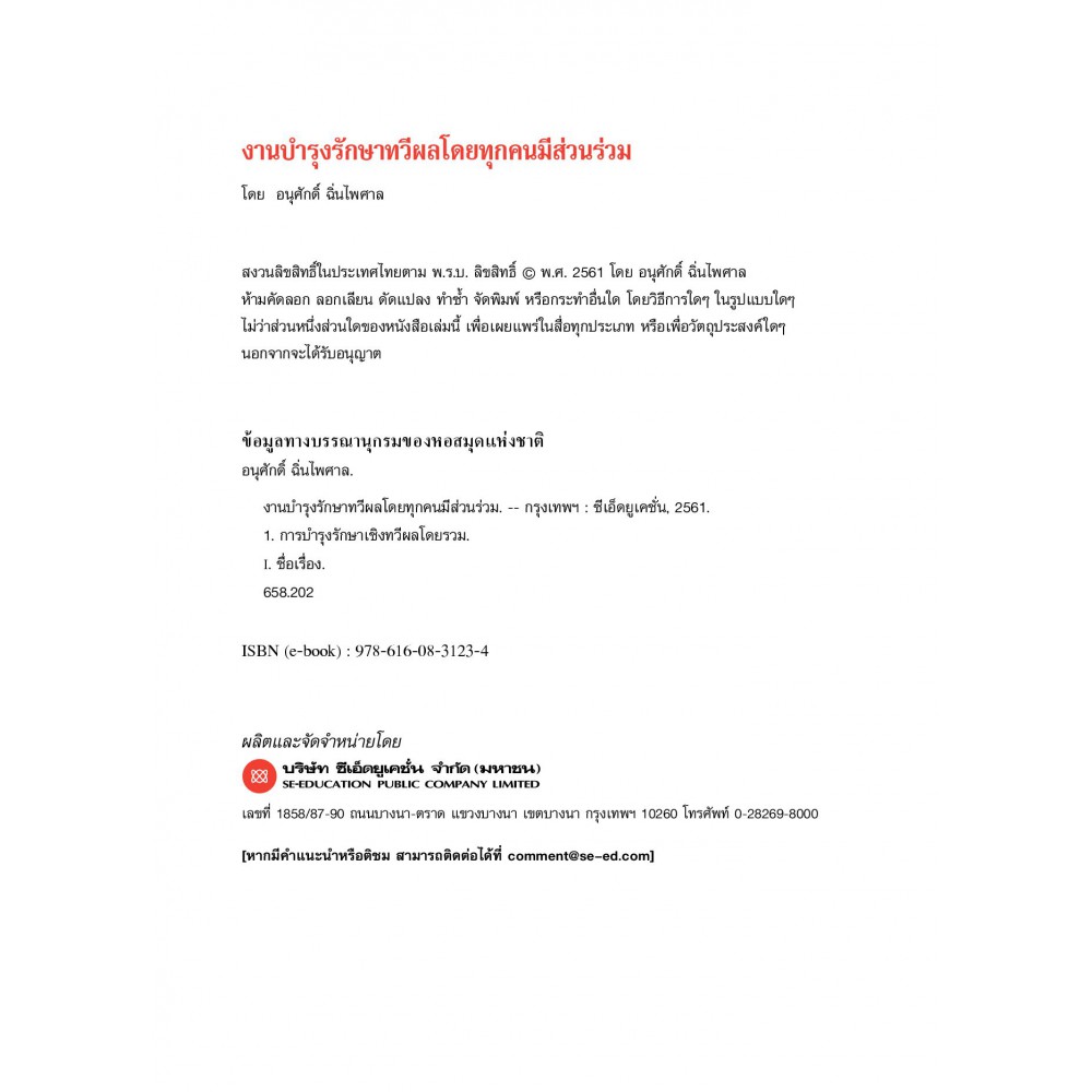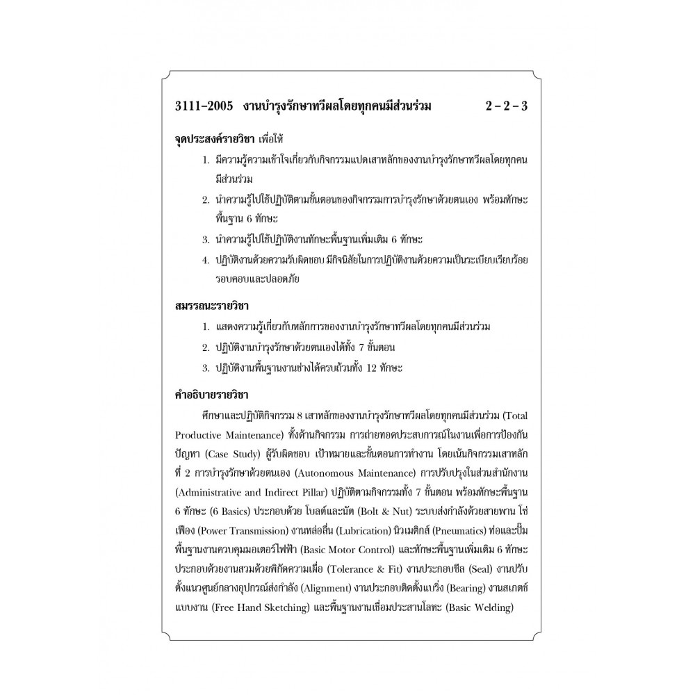 "งานบำรุงรักษาทวีผลโดยทุกคนมีส่วนร่วม รหัสวิชา 3111-2005" เล่มนี้ เขียนขึ้นตรงตามจุดประสงค์รายวิชา คำอธิบายรายวิชา และสมรรถนะรายวิชา หลักสูตรประกาศนียบัตรวิชาชีพชั้นสูง พุทธศักราช 2557 ของสำนักงานคณะกรรมการการอาชีวศึกษา กระทรวงศึกษาธิการ เนื้อหาเกี่ยวข้องกับงานบำรุงรักษาทวีผลโดยทุกคนมีส่วนร่วมในภาคอุตสาหกรรม เหมาะสำหรับนักศึกษา และผู้ที่มีความสนใจในเรื่องงานบำรุงรักษาทวีผลโดยทุกคนมีส่วนร่วม สารบัญ บทที่ 1 การบำรุงรักษาทวีผลโดยทุกคนมีส่วนร่วม (Total Productive Maintenance) บทที่ 2 การบำรุงรักษาด้วยตนเอง (Autonomous Maintenance) บทที่ 3 การหล่อลื่น (Lubrication) บทที่ 4 พื้นฐาน 6 ทักษะ (6 Basics) บทที่ 5 ทักษะพื้นฐานเพิ่มเติม 6 ทักษะ งานสวมด้วยพิกัดความเผื่อ (Tolerance & Fit) และงานสเกตซ์แบบงาน (Free Hand Sketching) บทที่ 6 นิวเมติกส์ (Pneumatics) บทที่ 7 พื้นฐานงานเชื่อมประสานโลหะ (Basic Welding)