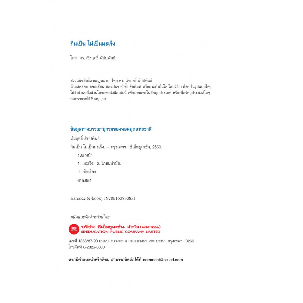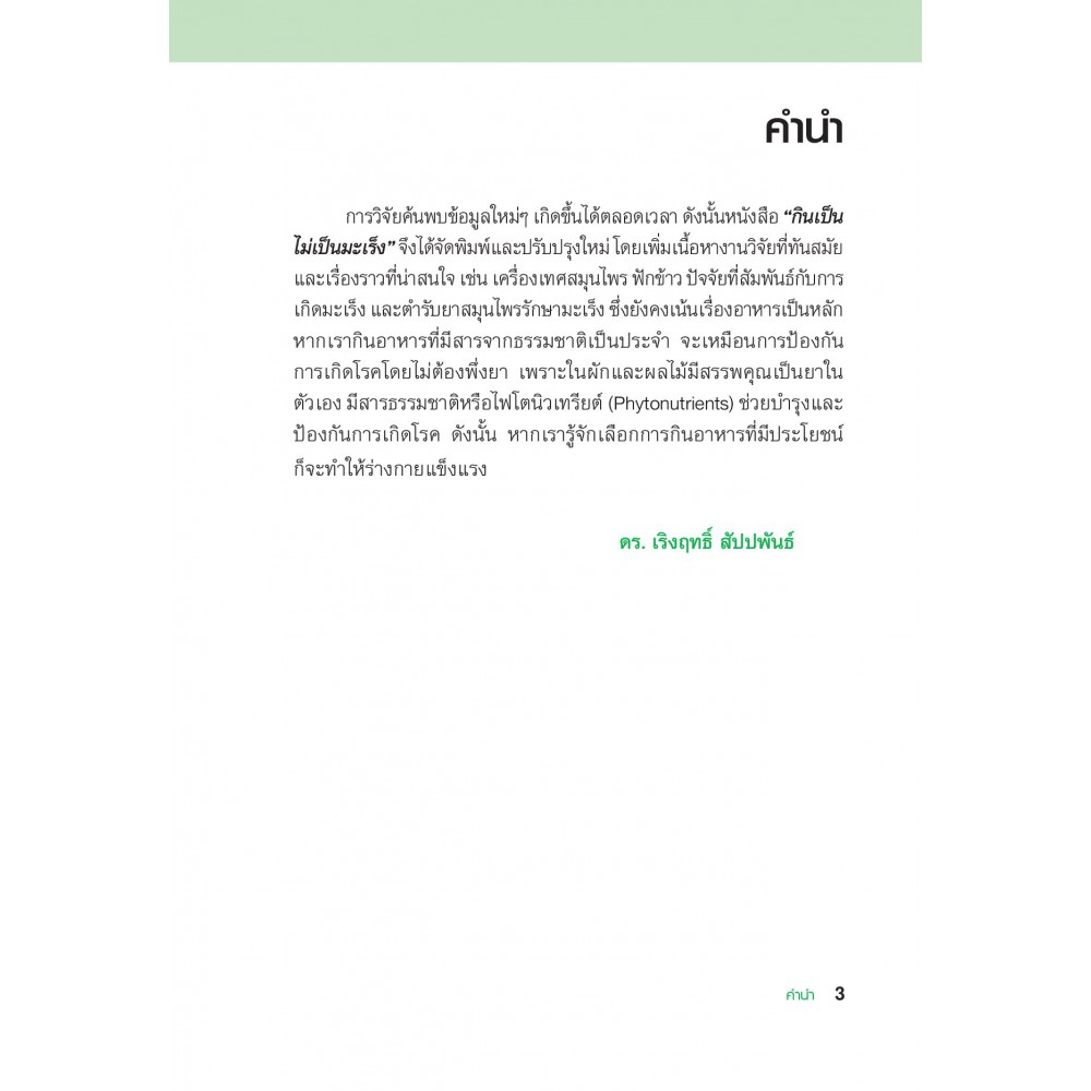 "กินเป็น ไม่เป็นมะเร็ง" เล่มนี้ นำเสนองานวิจัยทางด้านโภชนาการมาถ่ายทอดด้วยสำนวนการเขียนที่อ่านง่าย และสามารถนำไปใช้ในชีวิตประจำวันได้จริง เพื่อสุขภาพที่ดี ห่างไกลจากโรคร้าย ทั้งหมดเป็นประสบการณ์ตรงของผู้เขียนในการทำวิจัยด้านมะเร็ง การเข้าร่วมประชุมวิชาการ การค้นคว้าวิจัยใหม่ ๆ ตลอดจนศึกษาภูมิปัญญาชาวบ้านและแพทย์แผนตะวันออกในการนำสมุนไพรมารักษาโรค
