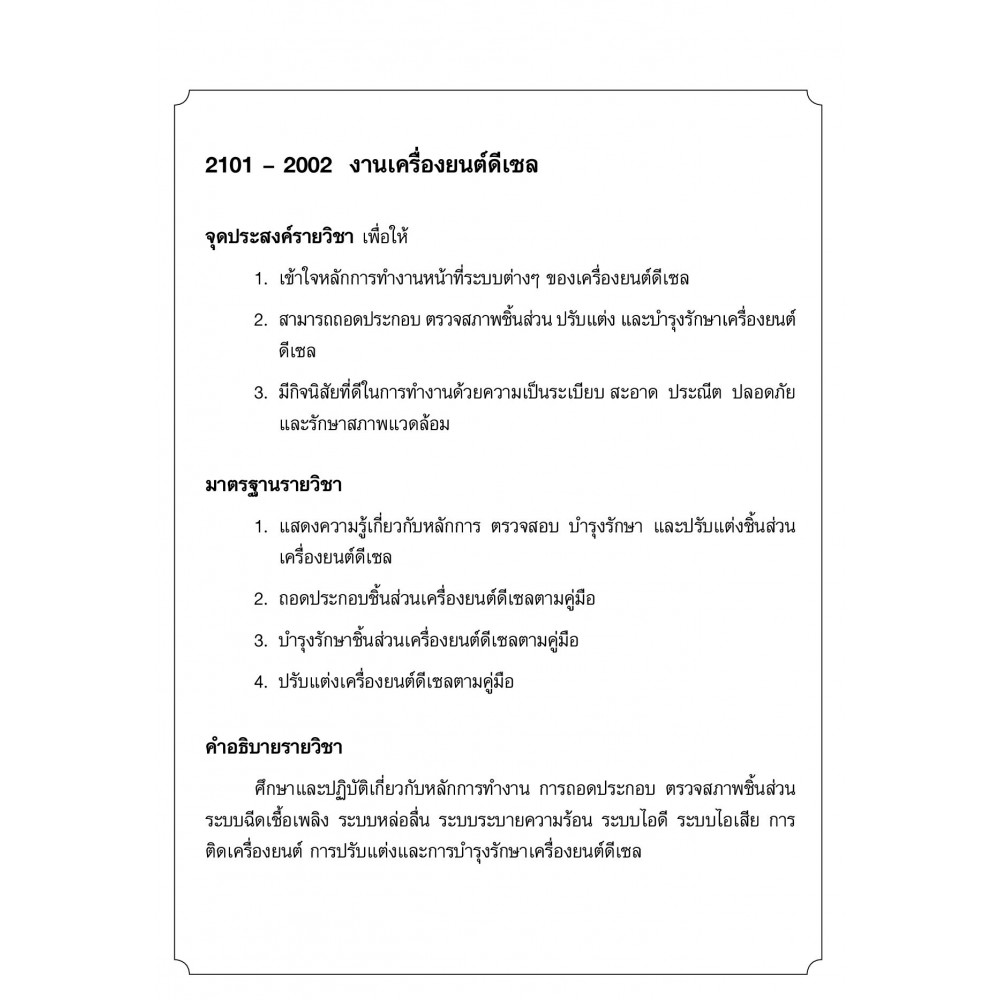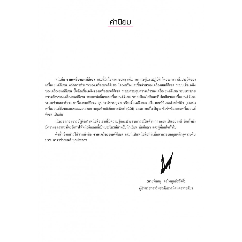 ให้เนื้อหาที่สำคัญเกี่ยวกับงานเครื่องยนต์ดีเซล ตรงตามหลักสูตรของสำนักงานคณะกรรมการการอาชีวศึกษา ครอบคลุมในเรื่องประวัติของเครื่องยนต์ดีเซล หลักการทำงานของเครื่องยนต์ดีเซล โครงสร้างและชิ้นส่วนของเครื่องยนต์ดีเซล ระบบเชื้อเพลิงของเครื่องยนต์ ปั๊มฉีดเชื้อเพลิงของเครื่องยนต์ดีเซล ระบบควบคุมความเร็วของเครื่องยนต์ดีเซล ระบบระบายความร้อนของเครื่องยนต์เซล ระบบควบคุมความเร็วของเครื่องยนต์ดีเซล และการแก้ไขปัญหาข้อขัดข้องของเครื่องยนต์ดีเซล อธิบายเนื้อหาโดยละเอียด เป็นลำดับขั้นตอน พร้อมตัวอย่างหลากหลาย เข้าใจง่าย เหมาะสำหรับนักศึกษาระดับ ปวช.