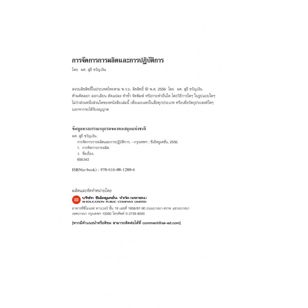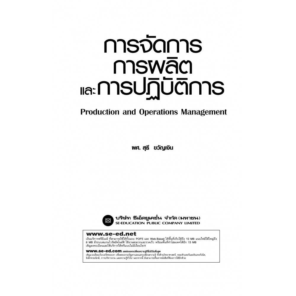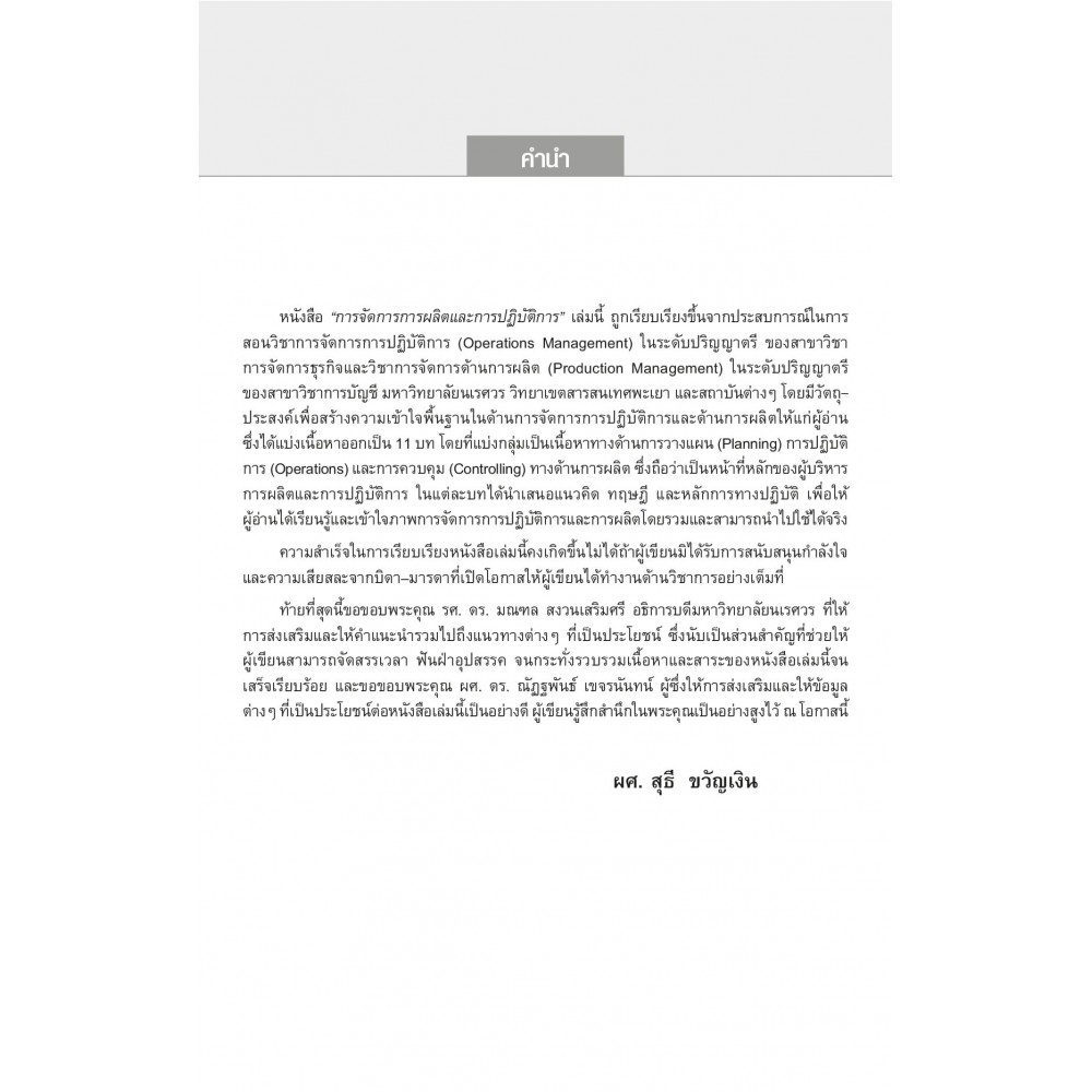 การจัดการการผลิตและการปฏิบัติการ เล่มนี้ ถูกเรียบเรียงขึ้นจากประสบการณ์ การสอน การค้นคว้า และการทำงานของผู้เขียน ดดยมีวัตถุประสงค์ให้เป็นหนังสือเรียนสำหรับการศึกษาวิชาการจัดการด้านการผลิต การจัดการด้านการปฏิบัติการ การบริหารการผลิต การบริหารการดำเนินงานและการผลิต หรือการบริหารอุตสาหกรรม สำหรับนิสิต นักศึกษา ทั้งในระดับปริญญาตรีและปริญญาโท สาขาวิชาการจัดการธุรกิจ สาขาวิชาบริหารธุรกิจ และสาขาวิชาที่เกี่ยวข้อง โดยผู้เขียนได้สร้างความเข้าใจพื้นฐานในการจัดการด้านการผลิตและการปฏิบัติการให้แก่ผู้อ่าน เพื่อให้เกิดความรู้และแยวคิดที่สามารถนำไปประยุกต์ใช้ให้เข้ากับการดำเนินงานของธุรกิจ ซึ่งจะทำให้ธุรกิจมีความได้เปรียบในการแข่งขันและเพิ่มประสิทธิภาพด้านการผลิตให้ดียิ่งขึ้น