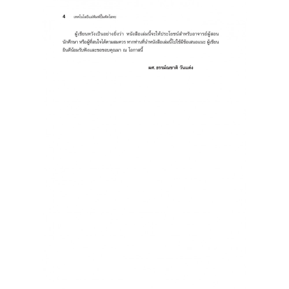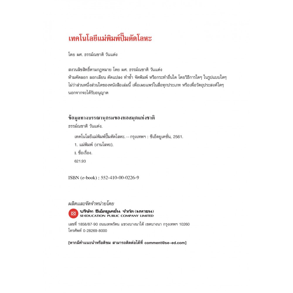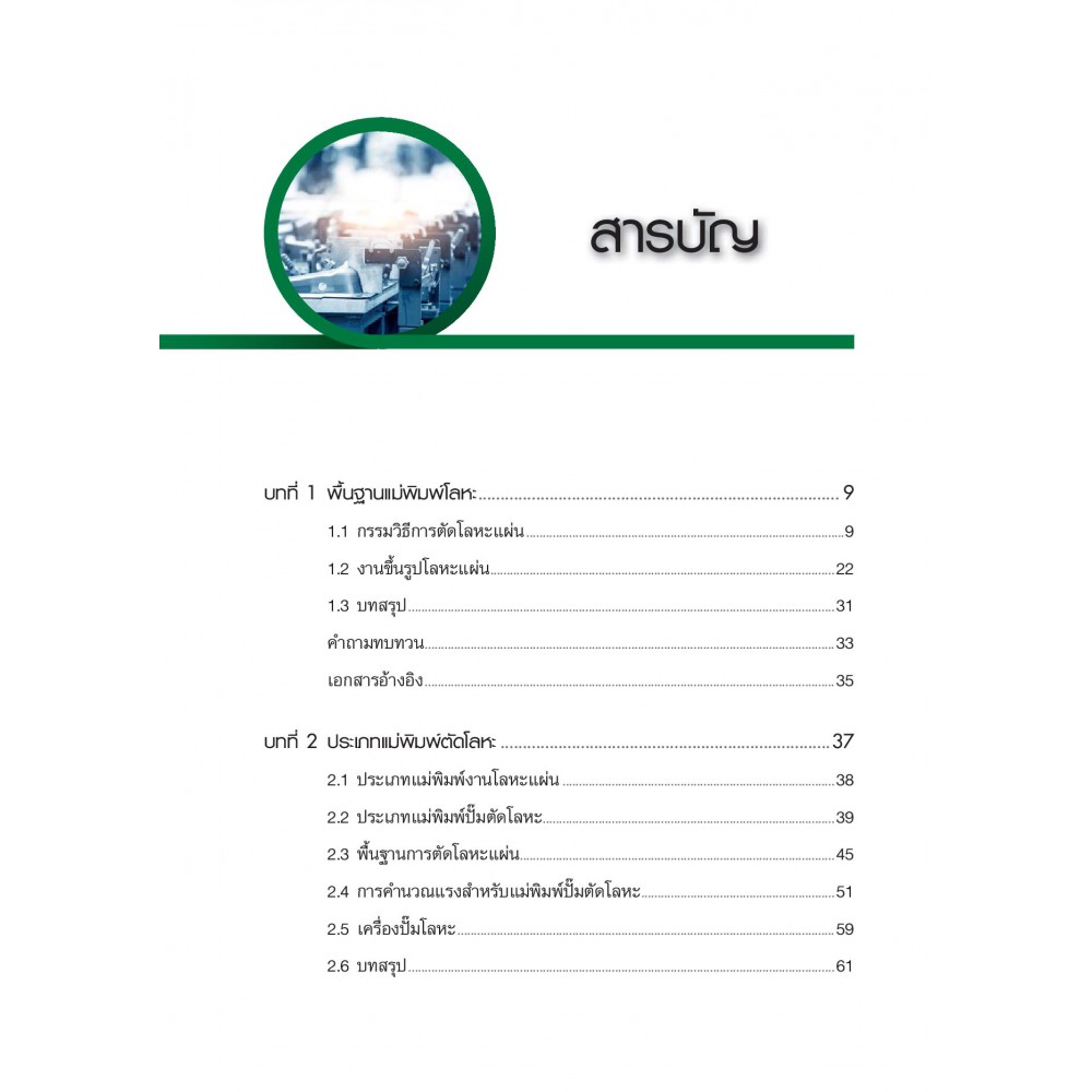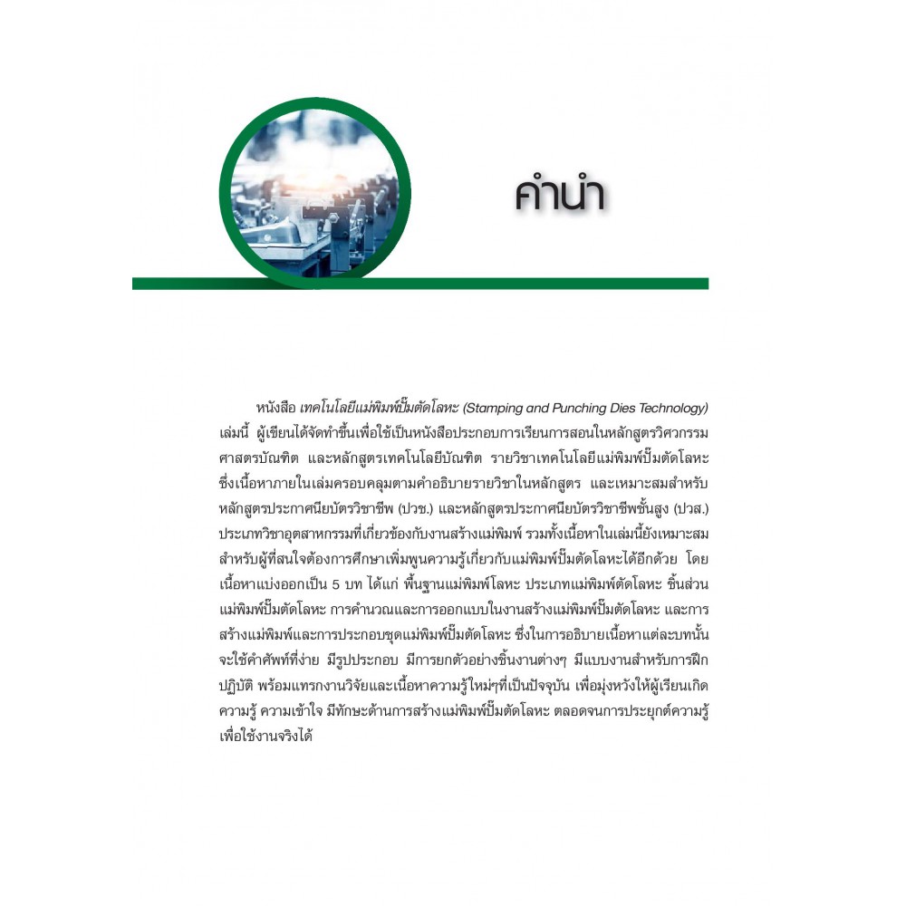 "เทคโนโลยีแม่พิมพ์ปั๊มตัดโลหะ" ประกอบการเรียนการสอนในหลักสูตรวิศวกรรมศาสตรบัณฑิต และหลักสูตรเทคโนโลยีบัณฑิต รายวิชาเทคโนโลยีแม่พิมพ์ปั๊มตัดโลหะ นอกจากนี้ยังเหมาะสำหรับหลักสูตรประกาศนียบัตรวิชาชีพ (ปวช.) และหลักสูตรประกาศนียบัตรวิชาชีพชั้นสูง (ปวส.) ประเภทวิชาอุตสาหกรรม โดยเนื้อหาแบ่งออกเป็น 5 บท ได้แก่ พื้นฐานแม่พิมพ์โลหะ ประเภทแม่พิมพ์ตัดโลหะ ชิ้นส่วนแม่พิมพ์ปั๊มตัดโลหะ การคำนวณและการออกแบบในงานสร้างแม่พิมพ์ปั๊มตัดโลหะ และการสร้างแม่พิมพ์และการประกอบชุดแม่พิมพ์ปั๊มตัดโลหะ ในเล่มอธิบายเนื้อหาอย่างละเอียด พร้อมมีตัวอย่างประกอบ บทสรุป และคำถามม้ายบท เพื่อทบทวนความรู้ความเข้าใจ