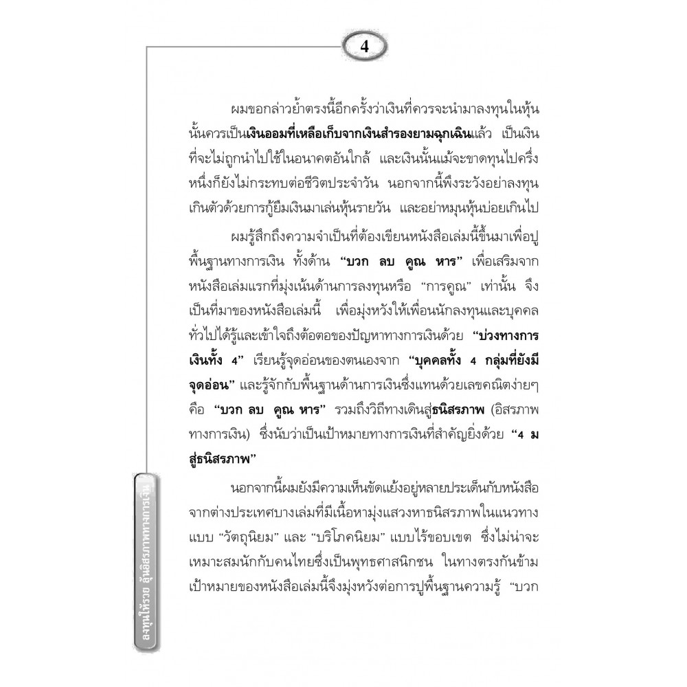 แนะนำวิธีการเก็บออมเงินโดยนำเทคนิค "บวก ลบ คูณ หาร" มาใช้ การบวกเงินคือการหารายได้จากแรงงานที่สูงกว่าค่าใช้จ่ายในแต่ละเดือน การลบเงินคือค่าใช้จ่ายต่างๆ ของแต่ละคนซึ่งควรจะน้อยกว่ารายได้ การคูณเงินคือการเพิ่มมูลค่าให้กับเงินด้วยการลงทุนต่างๆ ส่วนการหารเงินคือภาษีและภาระเงินเฟ้อ จากนั้นจึงนำเงินที่เก็บออมไปลงทุนในสินทรัพย์ที่มีความเสี่ยงต่ำแต่ให้ผลตอบแทนที่สูง ซึ่งก็คือการคูณเงินอย่างหนึ่ง การลงทุนดังกล่าวเป็นประโยชน์ต่อชนชั้นกลางที่กำลังสร้างตัวเพื่อให้มีอิสรภาพทางการเงิน โดยเดินตามแนวคิดเศรษฐกิจพอเพียง โดยการรู้จักใช้จ่าย ไม่ฟุ่มเฟือย และที่สำคัญคือให้รู้เท่าทันสินเชื่อเพื่อการบริโภคคือสินเชื่อบัตรเครดิตทั้งหลายที่ขยายตัวอย่างรวดเร็ว ถ้าเราหลงทางไปกับสินเชื่อเหล่านี้ จะทำให้เราก่อหนี้เกินตัวได้