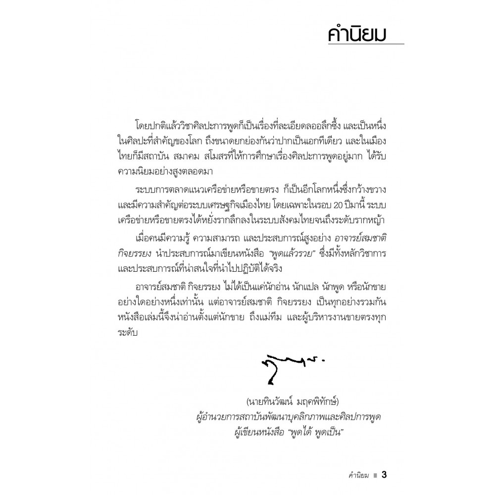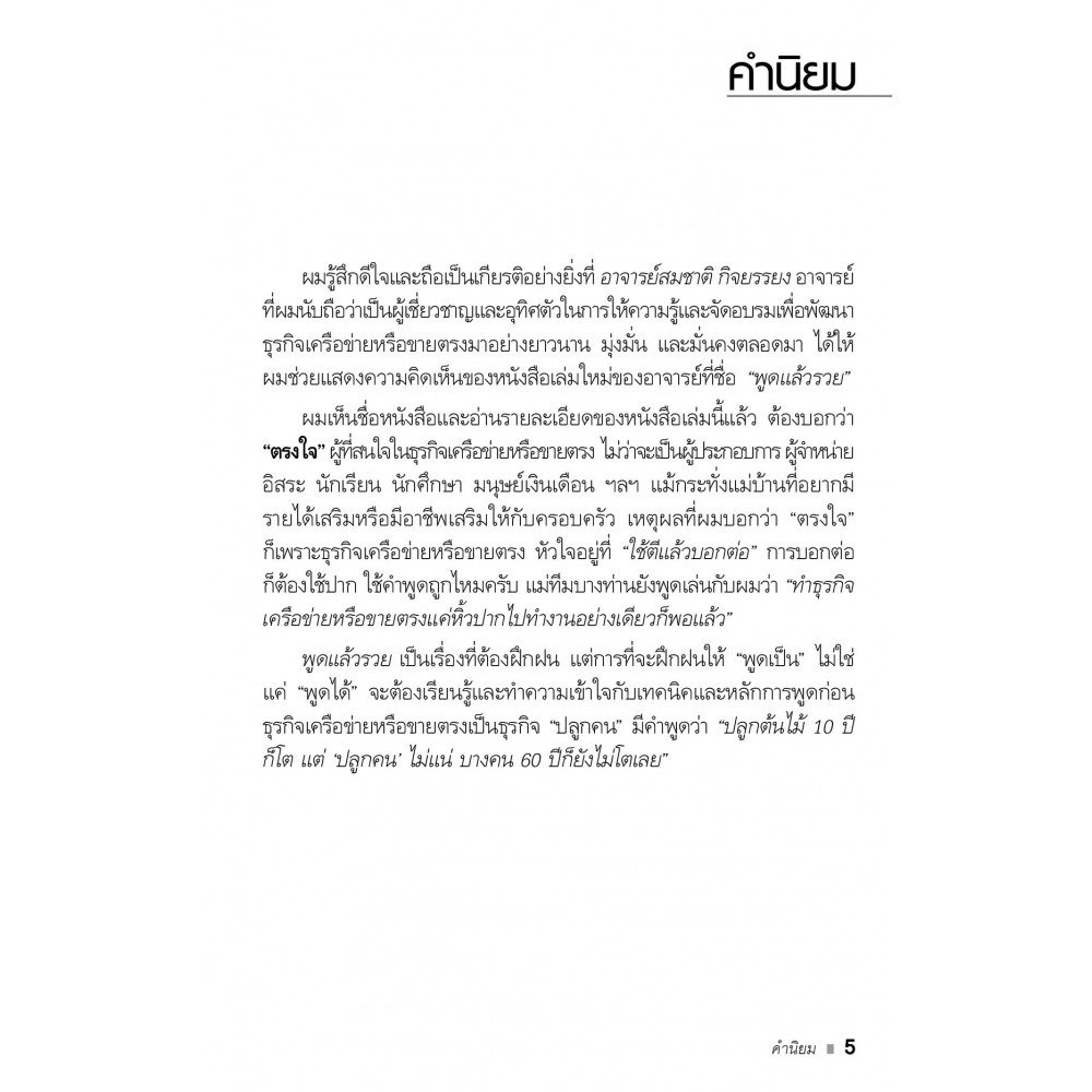 ในการทำธุรกิจเครือข่ายและขายตรงนั้น การพูดให้คนทั่วไปฟังเพื่อให้เขามาสมัครเป็นดาวน์ไลน์ การพูดเพื่อกระตุ้นลูกทีมให้สร้างผลงาน การพูดในการประชุมนักขาย และการเป็นวิทยากรในการฝึกอบรมนักขายนั้นมีวีธีการพูดที่แตกต่างกันไป การฝึกฝนให้พูดเป็นที่ไม่ใช่แค่พูดได้นั้น จะต้องเรียนรู้และทำความเข้าใจกับเทคนิคและหลักการพูดที่ถูกต้อง เพื่อให้พูดได้ตรงใจกับกลุ่มผู้ฟัง หนังสือเล่มนี้จะอธิบายถึงวิธีการพูดให้คนแต่ละกลุ่มฝัง เพราะธุรกิจนี้จะประสบความสำเร็จหรือล้มเหลวก็อยู่ที่การใช้คำพูดที่สามารถสื่อสารให้คนฟังแต่ละกลุ่มเข้าใจ และมาสมัครเป็นสมาชิกในทีมเรา