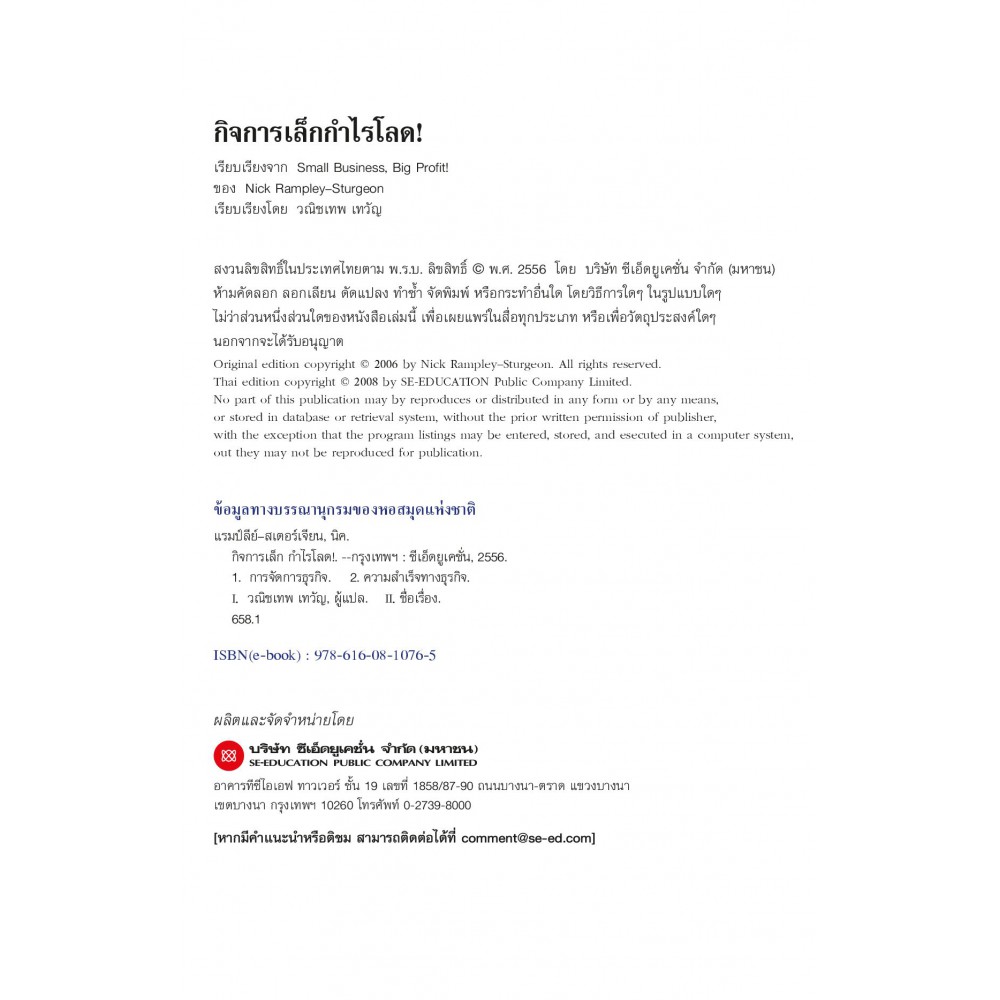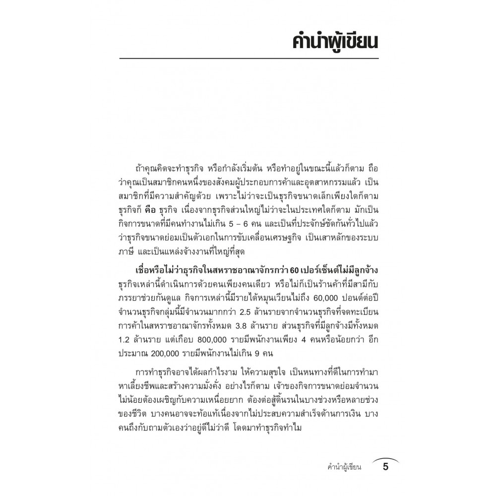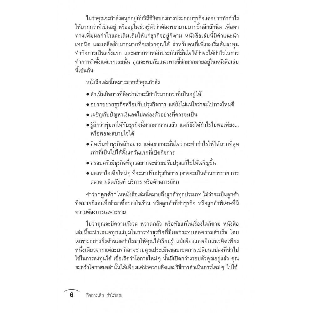 คำแนะนำ เทคนิค และเคล็ดลับมากมายที่จะช่วยคุณได้ สำหรับคนที่เพิ่งจะเริ่มต้นลงทุนทำกิจการเป็นครั้งแรก และอยากหาหลักประกันที่มั่นใจได้ว่าจะได้กำไรในการทำการค้าตั้งแต่ครั้งแรกเลยนั้น คุณจะพบแนวทางชี้นำมากมายจากในเล่ม แล้วคุณจะรู้ว่าการทำธุรกิจขนาดย่อมให้ได้กำไรสูงและงดงามนั้นไม่ใช่เรื่องยากอีกต่อไป...