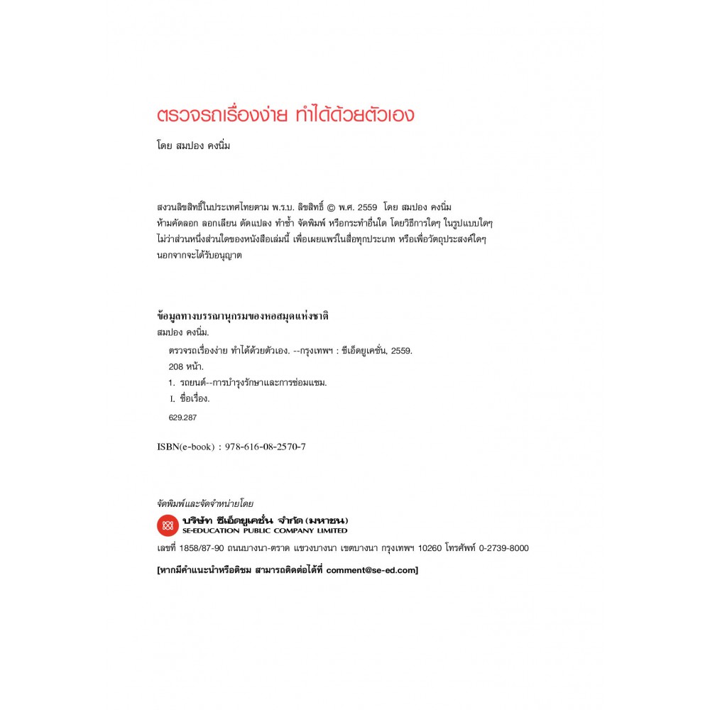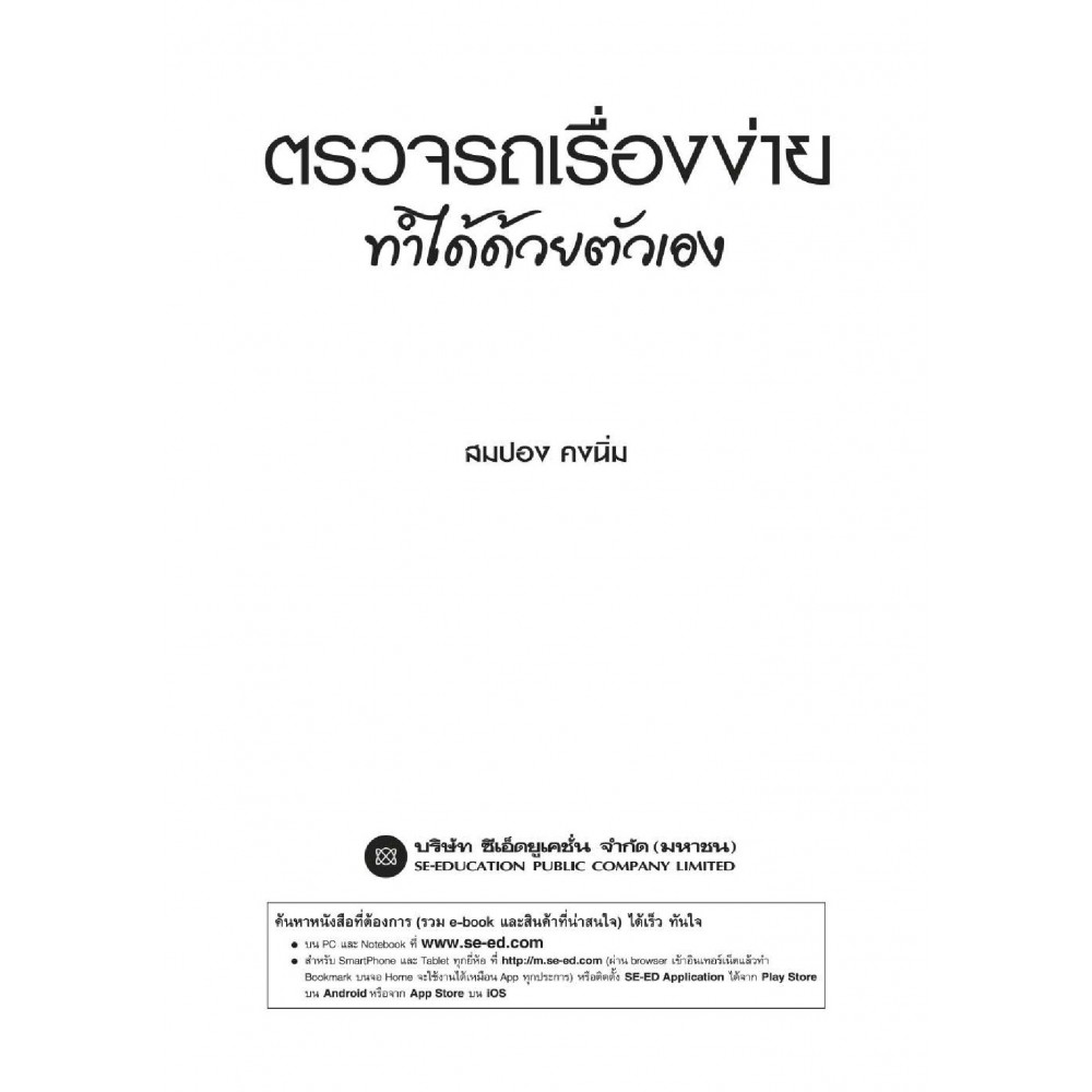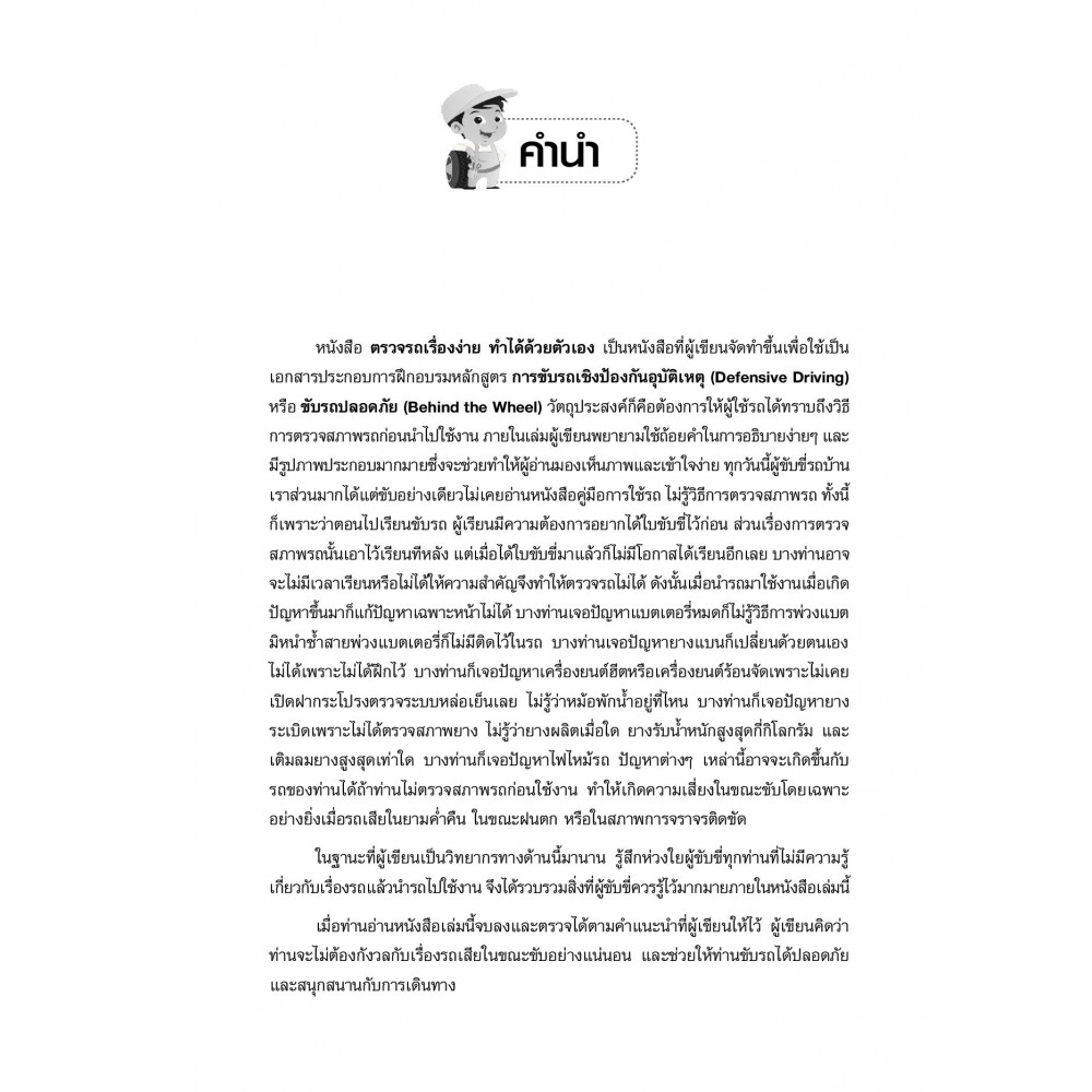 ให้คำแนะนำในการตรวจสภาพรถง่ายๆ ไม่ยุ่งยากซับซ้อน มีภาพประกอบคำอธิบายมากมาย เข้าใจง่าย ซึ่งถ้าทุกท่านปฏิบัติตามคำแนะนำของผู้เขียน รับรองว่าจะไม่เผชิญปัญหาเรื่องรถเสียในขณะขับอย่างแน่นอน หนังสือเล่มนี้จะช่วยให้คุณขับรถถึงจุดหมายปลายทางได้อย่างปลอดภัย เหมาะสำหรับผู้ขับขี่รถทุกท่าน