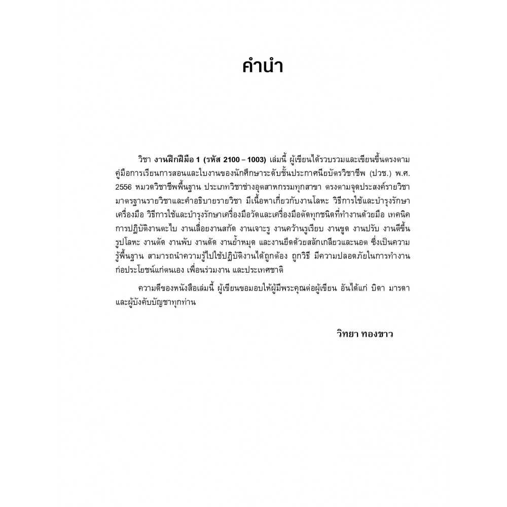 งานฝึกฝีมือ 1 ประกอบด้วยเรื่อง งานโลหะ วิธีการใช้และบำรุงรักษาเครื่องมือ วิธีการใช้และบำรุงรักษาเครื่องมือวัดและเครื่องมือตัดทุกชนิดที่ทำงานด้วยมือ เทคนิคการปฏิบัติงานตะไบ งานเลื่อย งานสกัด งานเจาะรู งานคว้านรูเรียบ งานขูด งานปรับ งานตีขึ้นรูปโลหะ งานตัด งานพับ งานดัด งานย้ำหมุด และงานยึดด้วยสลักเกลียวและนอต ซึ่งเป็นความรู้พื้นฐาน สามารถนำความรู้ไปใช้ปฏิบัติงานได้ถูกต้อง ถูกวิธี มีความปลอดภัยในการทำงาน ก่อประโยชน์แก่ตนเองเพื่อนร่วมงาน อีกทั้งมีรูปภาพประกอบเพื่อให้ผู้อ่านได้เข้าใจยิ่งขึ้น