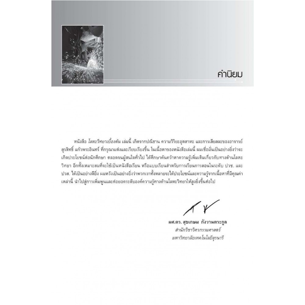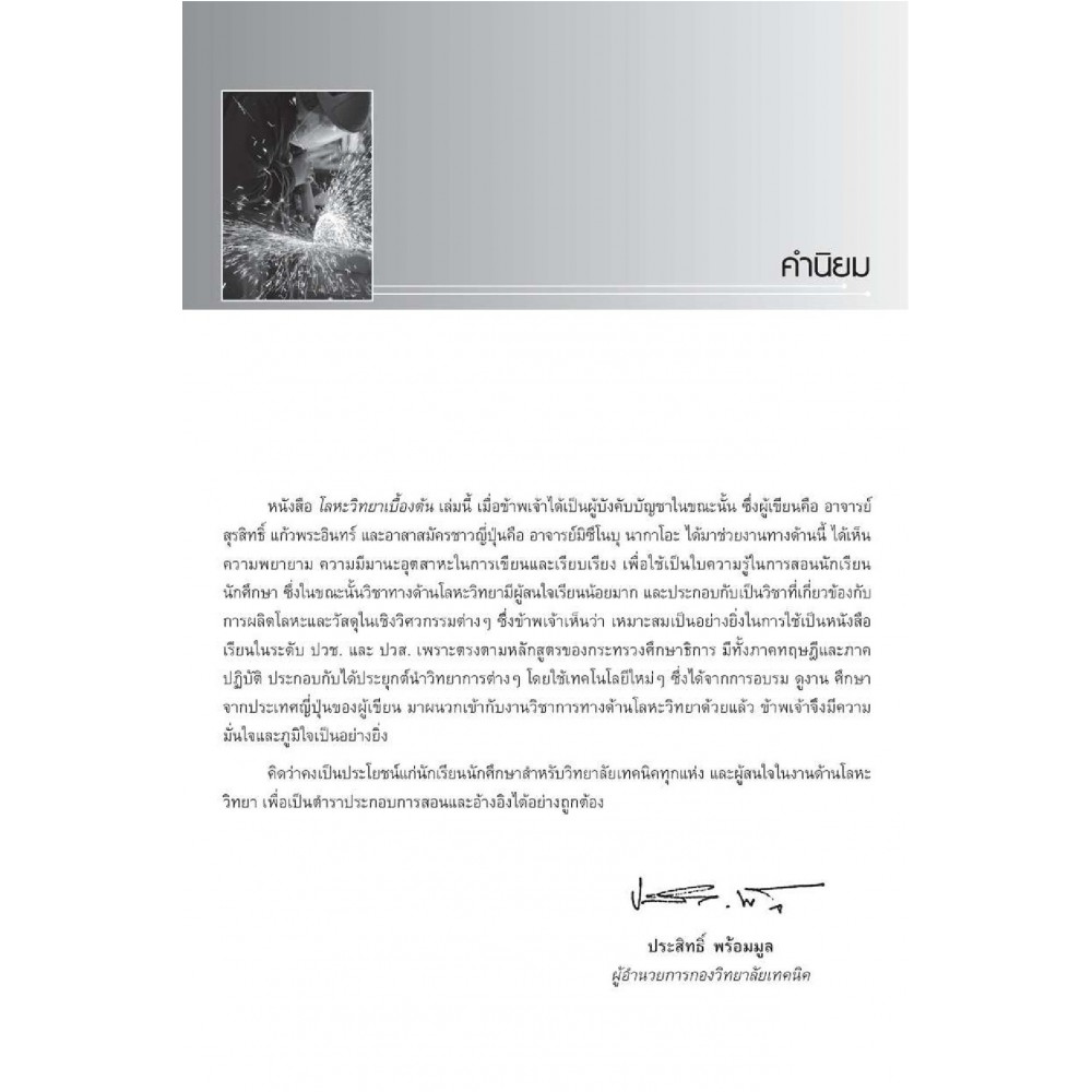 หนังสือ โลหะวิทยาเบื้องต้น เล่มนี้ เกิดจากปณิธาน ความวิริยะอุตสาหะ และการเสียสละของอาจารย์สุรสิทธิ์ แก้วพระอินทร์ ที่กรุณาแต่งและเรียบเรียงขึ้น ในเนื้อหาของหนังสือเล่มนี้ ผมเชื่อมั่นเป็นอย่างยิ่งว่าจะเกิดประโยชน์ต่อนักศึกษา ตลอดจนผู้สนใจทั่วไป ได้ศึกษาค้นคว้าหาความรู้เพิ่มเติมเกี่ยวกับทางด้านโลหะวิทยา อีกทั้งเหมาะสมที่จะใช้เป็นหนังสือเรียน หรือแบบเรียนสำหรับการเรียนการสอนในระดับ ปวช. และ ปวส. ได้เป็นอย่างดียิ่ง ผมหวังเป็นอย่างยิ่งว่าพวกเราทั้งหลายจะได้ประโยชน์และความรู้จากเนื้อหาที่มีคุณค่าเหล่านี้ นำไปสู่การเพิ่มพูนและต่อยอดระบองค์ความรู้ทางด้นโลหะวิทยาให้สูงยิ่งขึ้นต่อไป