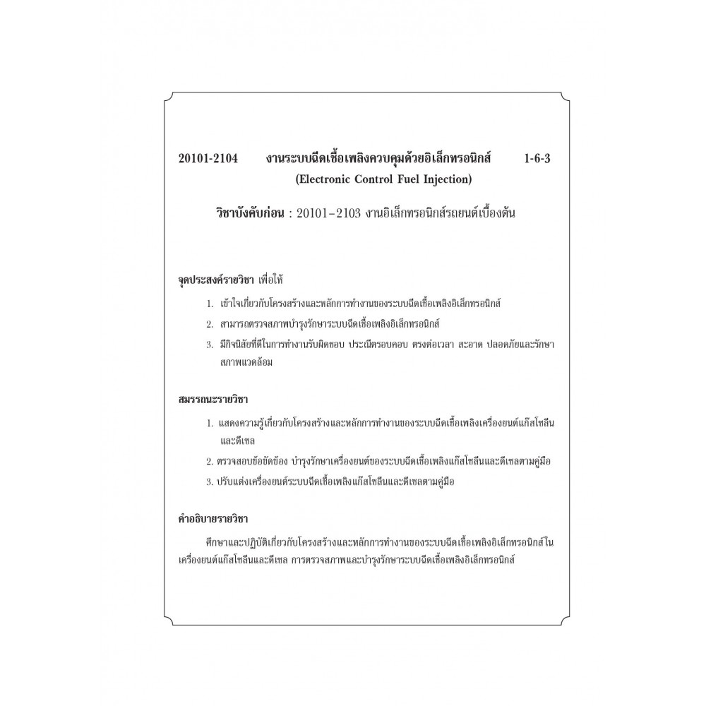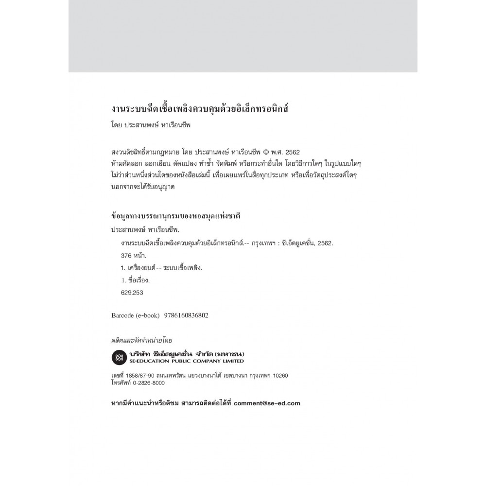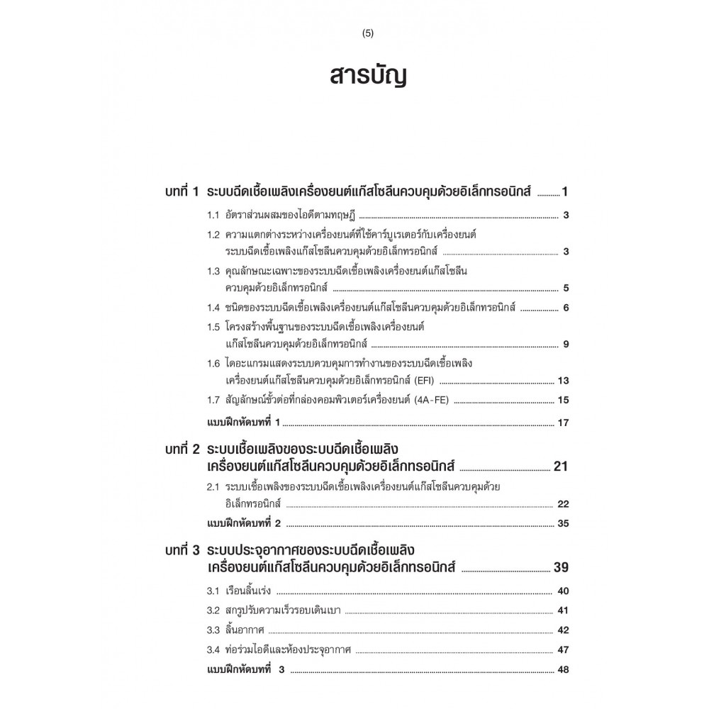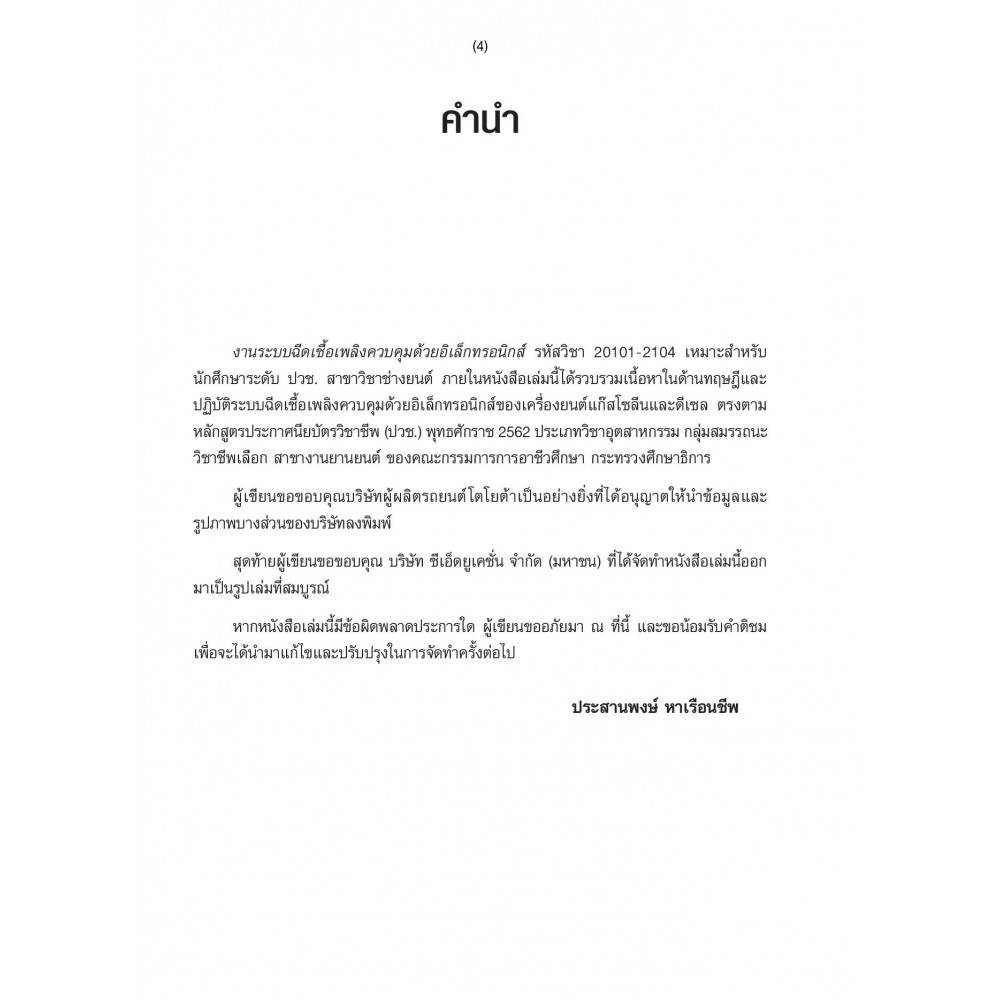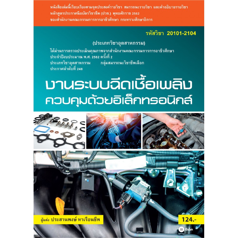 งานระบบฉีดเชื้อเพลิงควบคุมด้วยอิเล็กทรอนิกส์ (สอศ.) (รหัสวิชา 20101-2104) เรียบเรียงตามจุดประสงค์รายวิชา สมรรถนะรายวิชา และคำอธิบายรายวิชา หลักสูตรประกาศนียบัตรวิชาชีพ (ปวช.) พุทธศักราช 2562 ของสำนักงานคณะกรรมการการอาชีวศึกษา กระทรวงศึกษาธิการ ผู้เขียน ประสานพงษ์ หาเรือนชีพ "งานระบบฉีดเชื้อเพลิงควบคุมด้วยอิเล็กทรอนิกส์ รหัสวิชา 20101-2104" เรียบเรียงขึ้นตรงตามหลักสูตรประกาศนียบัตรวิชาชีพ (ปวช.) พุทธศักราช 2562 ของสำนักงานคณะกรรมการการอาชีวศึกษา กระทรวงศึกษาธิการ ประเภทวิชาอุตสาหกรรม กลุ่มสมรรถนะวิชาชีพเลือก มีเนื้อหาให้สามารถศึกษาและปฏิบัติ เกี่ยวกับโครงสร้างและหลักการทำงานของระบบฉีดเชื้อเพลิงอิเล็กทรอนิกส์ในเครื่องยนต์แก๊สโซลีนและดีเซล การตรวจสภาพและบำรุงรักษาระบบฉีดเชื้อเพลิงอิเล็กทรอนิกส์ ตรงตามคำอธิบายรายวิชาของกลุ่มวิชาช่างยนต์ที่ควรรู้ พร้อมแบบฝึกหัดท้ายบทเพื่อทบทวนความรู้ความเข้าใจ สารบัญ บทที่ 1 ระบบฉีดเชื้อเพลิงเครื่องยนต์แก๊สโซลีนควบคุมด้วยอิเล็กทรอนิกส์ บทที่ 2 ระบบเชื้อเพลิงของระบบฉีดเชื้อเพลิงเครื่องยนต์แก๊สโซลีนควบคุมด้วยอิเล็กทรอนิกส์ บทที่ 3 ระบบประจุอากาศของระบบฉีดเชื้อเพลิงเครื่องยนต์แก๊สโซลีนควบคุมด้วยอิเล็กทรอนิกส์ บทที่ 4 ระบบควบคุมอิเล็กโทรนิกส์ของระบบฉีดเชื้อเพลิงเครื่องยนต์แก๊สโซลีนควบคุมด้วยอิเล็กทรอนิกส์ บทที่ 5 หน้าที่ของคอมพิวเตอร์เครื่องยนต์ในการควบคุมการฉีดเชื้อเพลิง บทที่ 6 การจุดระเบิดล่วงหน้าด้วยอิเล็กทรอนิกส์ของระบบฉีดเชื้อเพลิงเครื่องยนต์แก๊สโซลีนควบคุมด้วยอิเล็กทรอนิกส์ บทที่ 7 ระบบควบคุมความเร็วรอบเดินเบาของระบบฉีดเชื้อเพลิงเครื่องยนต์แก๊สโซลีนควบคุมด้วยอิเล็กทรอนิกส์ บทที่ 8 ระบบวิเคราะห์ปัญหาข้อขัดข้องของระบบฉีดเชื้อเพลิงเครื่องยนต์แก๊สโซลีนควบคุมด้วยอิเล็กทรอนิกส์ บทที่ 9 การตรวจสอบระบบฉีดเชื้อเพลิงเครื่องยนต์แก๊สโซลีนควบคุมด้วยอิเล็กทรอนิกส์ บทที่ 10 ระบบฉีดเชื้อเพลิงเครื่องยนต์ดีเซลควบคุมด้วยอิเล็กทรอนิกส์ บทที่ 11 การวิเคาระห์ปัญหาข้อขัดข้องของระบบฉีดเชื้อเพลิงเครื่องยนต์ดีเซลควบคุมด้วยอิเล็กทรอนิกส์ บทที่ 12 การตรวจสอบระบบฉีดเชื้อเพลิงเครื่องยนต์ดีเซลควบคุมด้วยอิเล็กทรอนิกส์ บทที่ 13 การบำรุงรักษาระบบฉีดเชื้อเพลิงเครื่องยนต์ดีเซลควบคุมด้วยอิเล็กทรอนิกส์