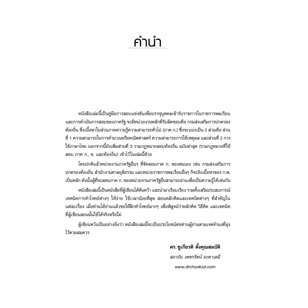 รวบรวมความรู้และแนวข้อสอบ เพื่อเป็นคู่มือสำหรับผู้ที่ต้องการสอบแข่งขันเพื่อบรรจุเข้ารับราชการ ในสังกัดกรมส่งเสริมการปกครองท้องถิ่น โดยเนื้อหาในส่วนภาคความรู้ความสามารถทั่วไป (ภาค ก.) จะแบ่งเป็น 2 ส่วนคือ ส่วน ที่ 1 ความสามารถในการคำนวณหรือคณิตศาสตร์ ความสามารถการใช้เหตุผล และส่วนที่ 2 การใช้ภาษาไทย นอกจากนี้ยังเพิ่มส่วนที่ 3 รวมกฎหมายสอบท้องถิ่น ฉบับล่าสุด (รวมกฎหมายที่ใช้สอบ ภาค ก., ข. และท้องถิ่น) เข้าไว้ในเล่มนี้อีกด้วย