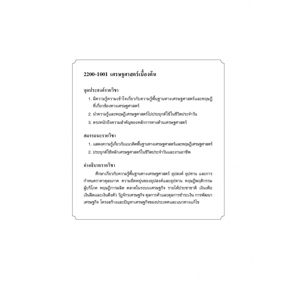 เนื้อหาประกอบด้วยความรู้เกี่ยวกับเศรษฐศาสตร์เบื้องต้น ระบบเศรษฐกิจ อุปสงค์ อุปทาน ความยืดหยุ่นของอุปสงค์และอุปทาน พฤติกรรมผู้บริโภค ทฤษฎีการผลิต ตลาดในระบบเศรษฐกิจ รายได้ประชาชาติ เงินเฟ้อ เงินฝืด ฯลฯ