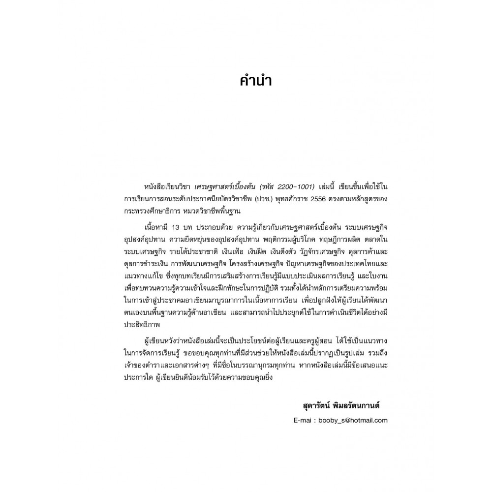 หนังสือ "เศรษฐศาสตร์เบื้องต้น" เล่มนี้ เขียนขึ้นเพื่อประกอบการเรียนการสอนในระดับ ปวช. เนื้อหาประกอบด้วย ความรู้เกี่ยวกับเศรษฐศาสตร์เบื้องต้น ระบบเศรษฐกิจ อุปสงค์อุปทาน ความยืดหยุ่นของอุปสงค์อุปทาน พฤติกรรมผู้บริโภค ทฤษฎีการผลิต ตลาดในระบบเศรษฐกิจ รายได้ประชาชาติ เงินเฟ้อเงินฝืดเงินตึงตัว วัฏจักรเศรษฐกิจ ดุลการค้าและดุลการชำระเงิน การพัฒนาเศรษฐกิจ โครงสร้างเศรษฐกิจ ปัญหาเศรษฐกิจของประเทศไทยและแนวทางแก้ไข โดยทุกบทเรียนจะมีการเสริมสร้างการเรียนรู้ มีแบบประเมินผลการเรียนรู้ และใบงาน เพื่อทบทวนความรู้ความเข้าใจและฝึกทักษะในการปฏิบัติ รวมทั้งได้นำความรู้เกี่ยวกับประชาคมอาเซียนมาบูรณาการในเนื้อหาการเรียนด้วย เพื่อปลูกฝังให้ผู้เรียนได้พัฒนาตนเอง สามารถนำไปประยุกต์ใช้ได้อย่างมีประสิทธิภาพ