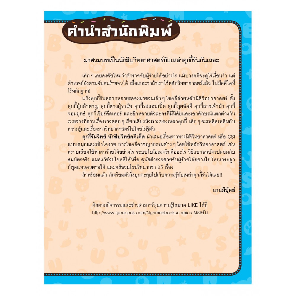 เหล่าตัวละครคุกกี้รันที่เด็กๆ ชื่นชอบจะมาเล่าเรื่องราวทางนิติวิทยาศาสตร์ชวนสงสัย 25 เรื่อง เช่น ลายนิ้วมือใช้สืบหาคนร้ายได้อย่างไร แมลงก็ช่วยไขคดีได้หรือ ตำรวจไซเบอร์คือใคร ทำไมคนถึงก่ออาชญากรรมมากในฤดูร้อน พร้อมขำกลิ้งไปกับเหล่าคุกกี้หลากรสที่มีคาแร็กเตอร์แตกต่างกัน
