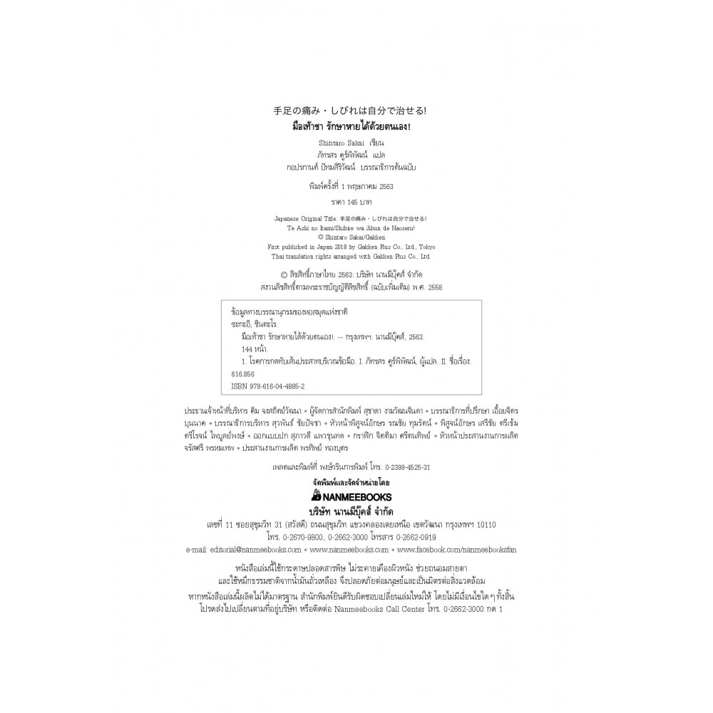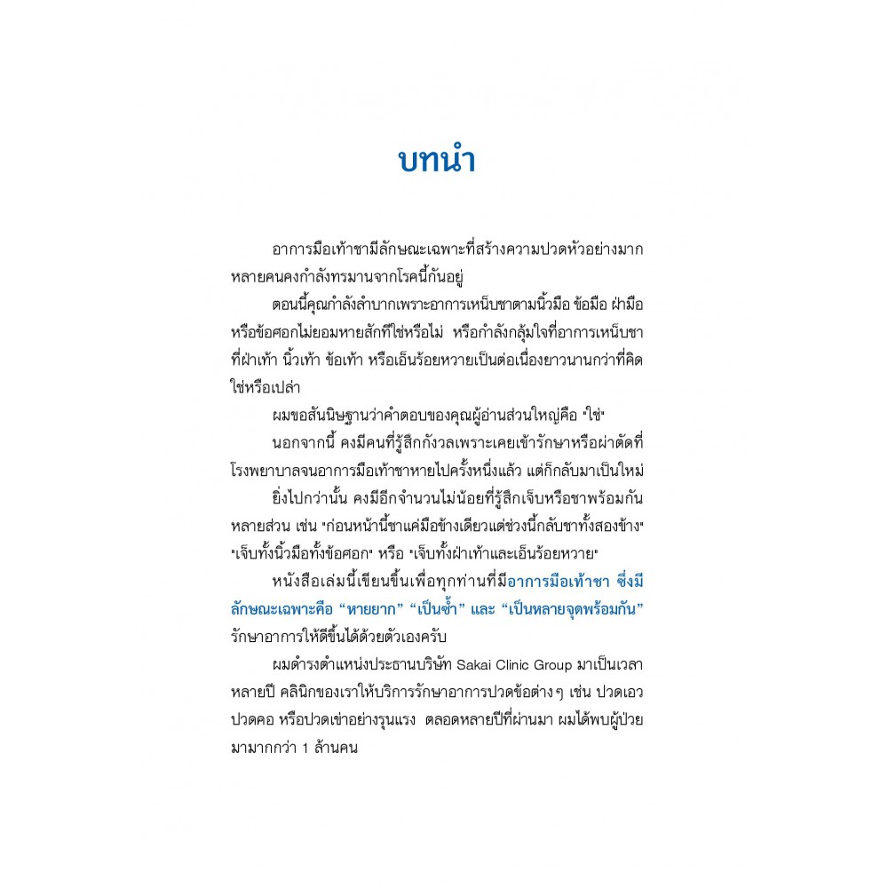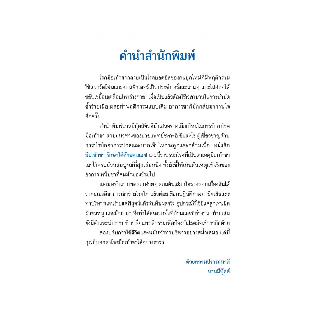 หนังสือ มือเท้าชา รักษาหายได้ด้วยตนเอง! เล่มนี้นำเสนอทางเลือกใหม่ในการรักษาโรค มือเท้าชา ตามแนวทางของนายแพทย์ซะกะอิ ชินตะโร ผู้เชี่ยวชาญด้านการบำบัดอาการปวด และบาดเจ็บในกระดูกและกล้ามเนื้อ รวบรวมโรคที่เป็นสาเหตุอาการมือเท้าชาเอาไว้ครบถ้วน