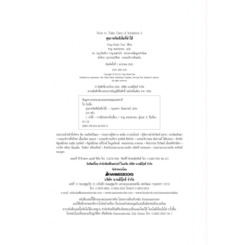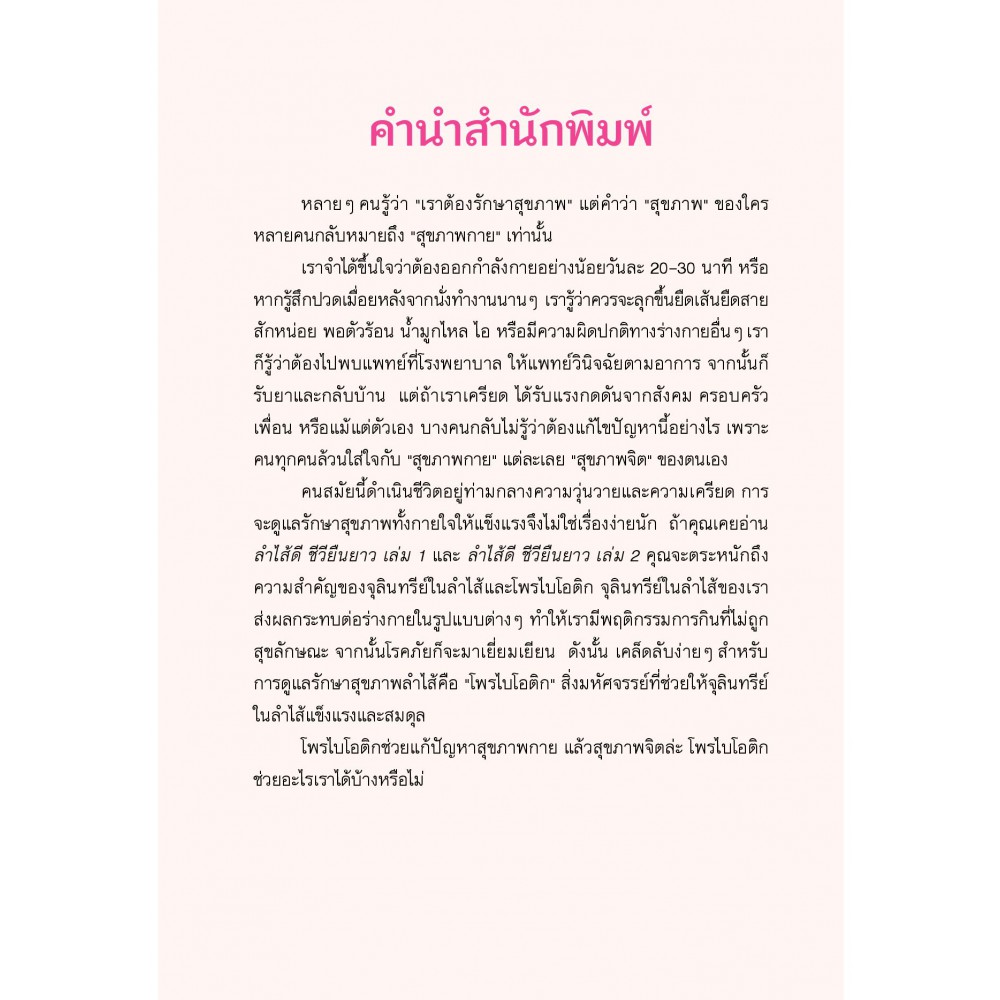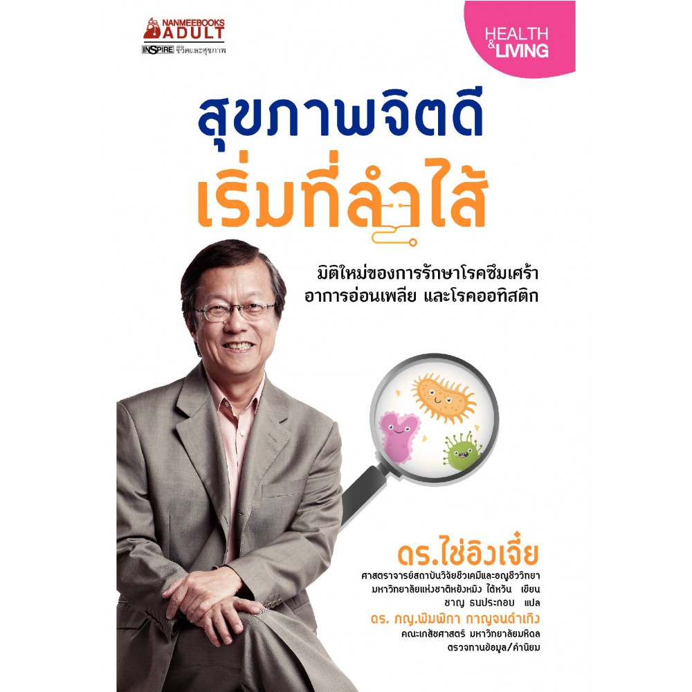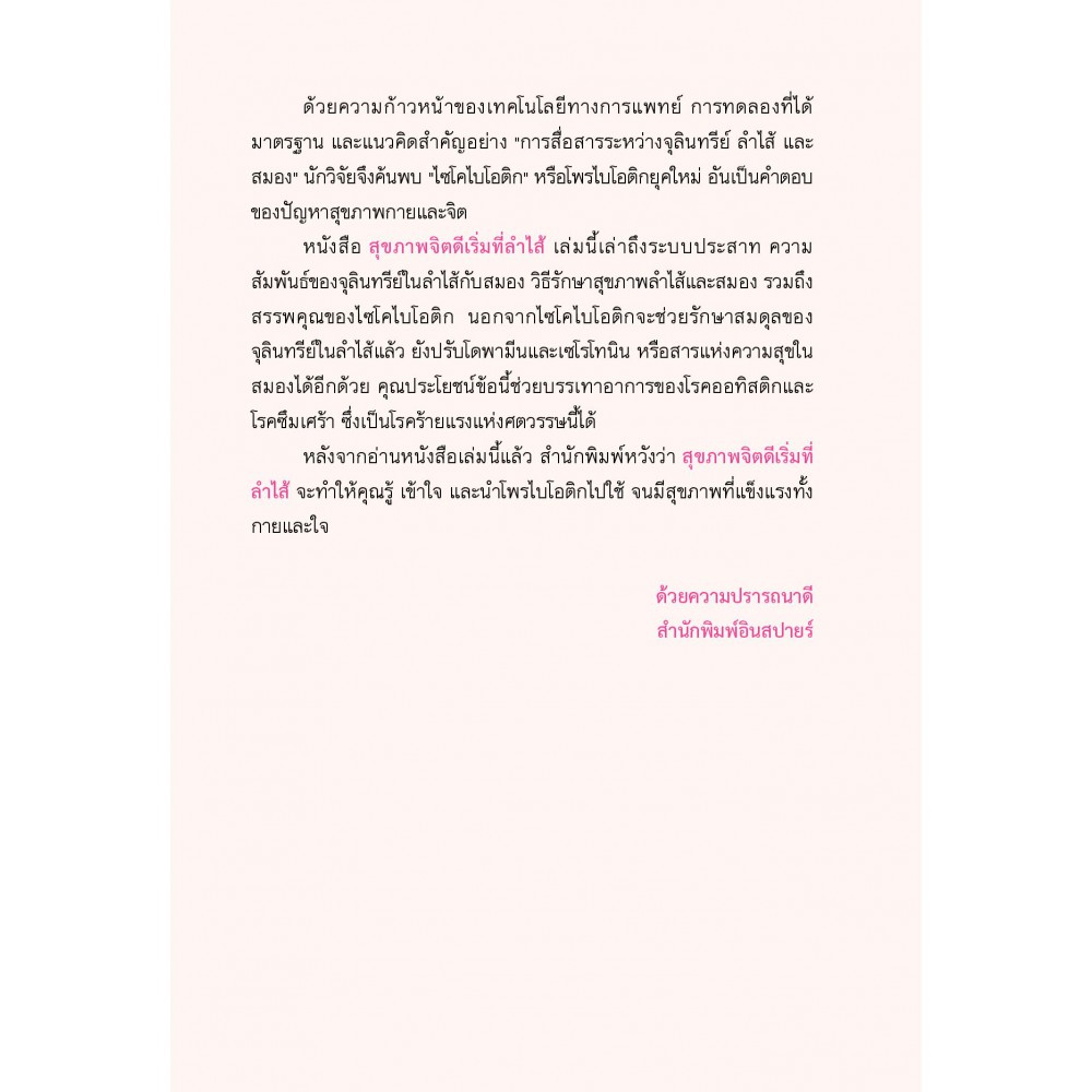 นักวิทยาศาสตร์ค้นพบแล้วว่ากุญแจสำคัญที่ควบคุมกลไกต่าง ๆ ในร่างกายคือ “การสื่อสาร ระหว่างจุลินทรีย์ ลำไส้ และสมอง” หนังสือ สุขภาพจิตดีเริ่มที่ลำไส้ จะเล่าถึงความสัมพันธ์ ระหว่างจุลินทรีย์ในลำไส้กับสมอง วิธีรักษาสุขภาพลำไส้และสมอง รวมถึงแนะนำโพรไบโอติก สายพันธุ์ใหม่ที่เรียกว่า “ไซโคไบโอติก” ซึ่งช่วยเพิ่มปริมาณโดพามีนและเซโรโทนินในสมองได้ คุณประโยชน์ข้อนี้ทำให้จุลินทรีย์ในลำไส้ไม่ได้มีประโยชน์ต่อสุขภาพกายเท่านั้น แต่ยังมีผลต่อ สุขภาพจิต และอาจนำไปสู่มิติใหม่ของการรักษาโรคซึมเศร้า โรคออทิสติก และโรคพาร์คินสันได้