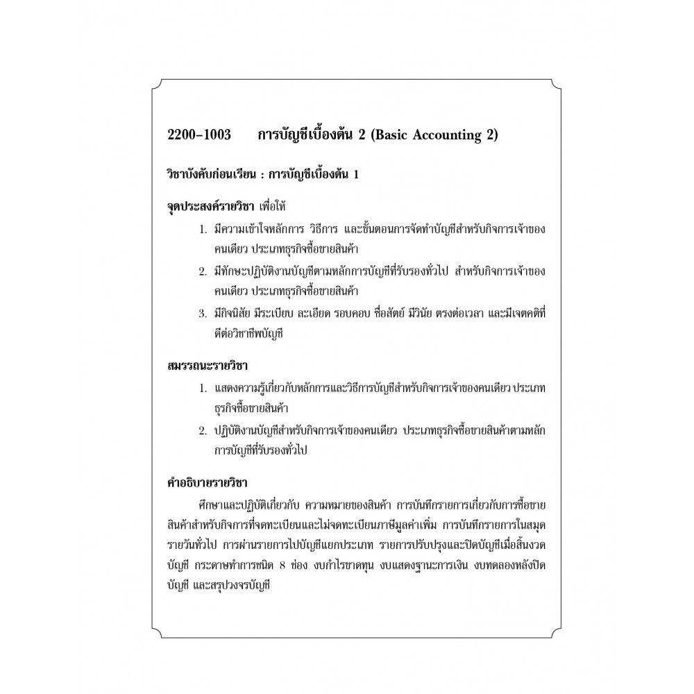 เนื้อหาในแต่ละส่วนของหนังสือเล่มนี้ครอบคลุมจุดประสงค์รายวิชา และคำอธิบายรายวิชา โดยในแต่ละบทจะมีแบบฝึกหัดทบทวนความรู้ความเข้าใจถึงหลักการ วิธีการ และขั้นตอนการจัดทำบัญชีสำหรับกิจการที่ประกอบธุรกิจ