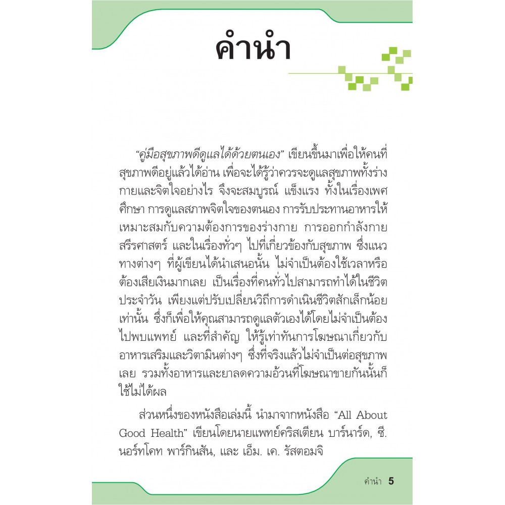 คู่มือที่คุณสามารถนำไปใช้ดูแลสุขภาพให้สมบูรณ์แข็งแรง ทั้งในเรื่องเพศศึกษา การดูแลสภาพจิตใจของตัวเอง อาหาร การออกกำลังกาย สรีรศาสตร์ และในเรื่องทั่วๆ ไปที่เกี่ยวข้องกับสุขภาพ ซึ่งแนวทางต่างๆ ที่ผู้เขียนเสนอแนะนั้นไม่จำเป็นต้องใช้เวลาหรือต้องเสียเงินมากเลย เป็นเรื่องที่ทำสามารถทำได้ในชีวิตประจำ เพียงแต่ปรับเปลี่ยนวิถีการดำเนินชีวิตเล็กน้อยเท่านั้น ก็เพื่อให้คุณสามารถดูแลตัวเองได้โดยไม่จำเป็นต้องไปพบแพทย์ และที่สำคัญ ให้คุณรู้เท่าทันการโฆษณาเกี่ยวกับอาหารเสริมและวิตามินต่างๆ ซึ่งที่จริงแล้วไม่จำเป็นต่อสุขภาพเลย รวมทั้งอาหารและยาลดความอ้วนที่โฆษณาขายกันนั้นก็ใช้ไม่ได้ผล