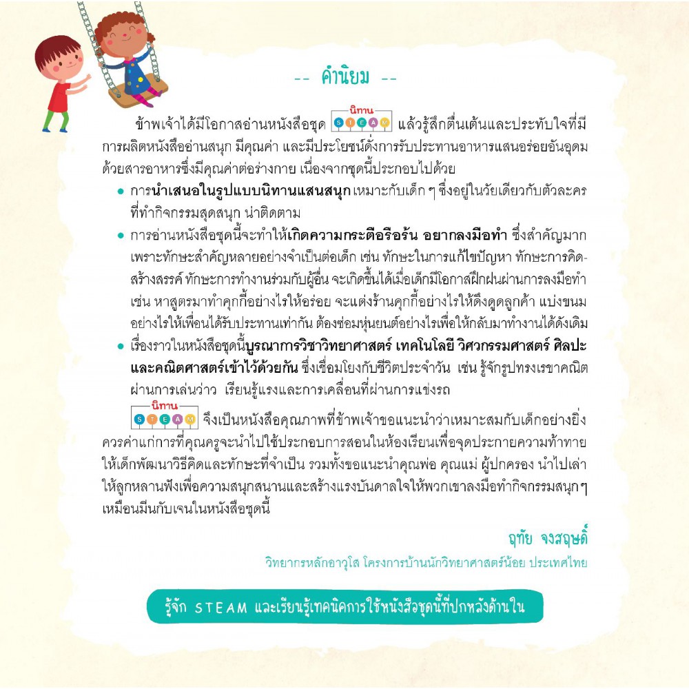 สนุกไปกับนิทานสร้างความรู้ส่งเสริมกระบวนการ STEAM N แต่ละเล่มประกอบไปด้วยนิทานสุดสนุก N เรื่องราวของมีนกับเจน นักวิทยาศาสตร์ตัวน้อยที่ต้องพบเจออุปสรรคมากมาย แต่พวกเขาก็เอาชนะความยากลำบากเหล่านั้นด้วยแนวคิดตามหลัก วิทยาศาสตร์ (Science) เทคโนโลยี (Technology) วิศวกรรมศาตร์ (Engineering) ศิลปะ (Art) และคณิตศาสตร์ (Maths) ท้ายเล่มมีคำถามทบทวนความรู้ เสริมสร้างเชาวน์ปัญญา เหมาะอย่างยิ่งกับเด็กปฐมวัยที่ต้องเริ่มเรียนรู้กระบวนการ STEAM