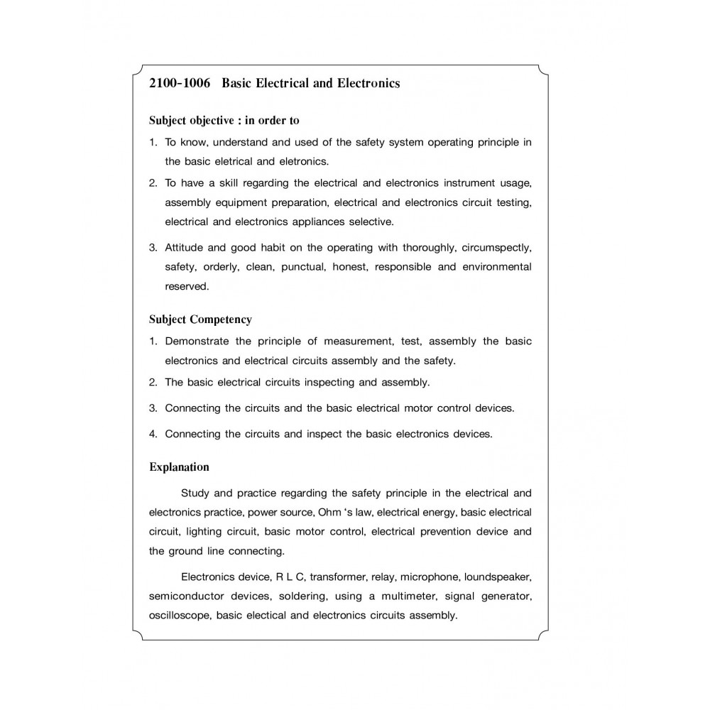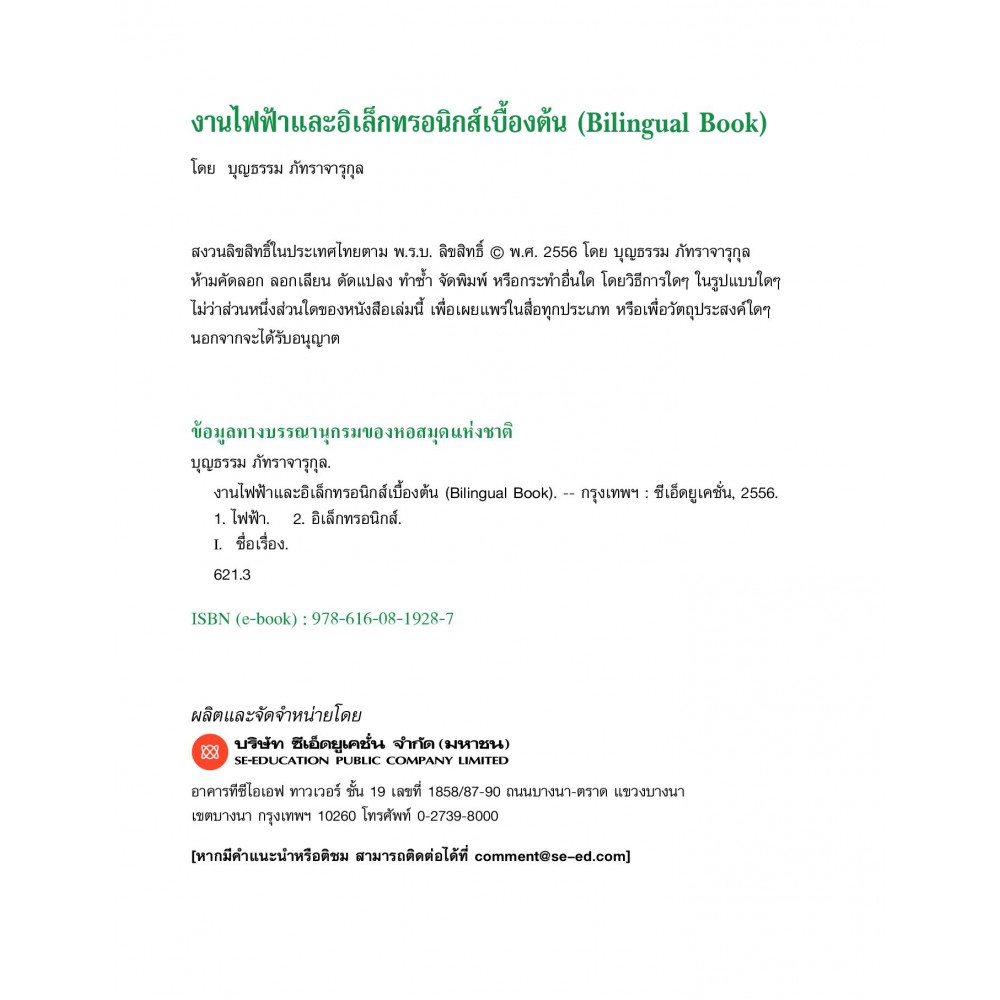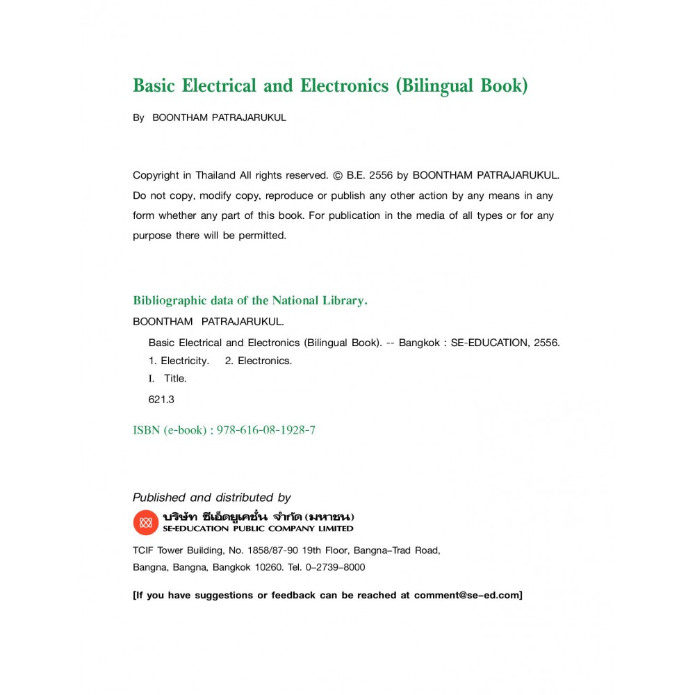 "งานไฟฟ้าและอิเล็กทรอนิกส์เบื้องต้น (Bilingual Book)" ตรงตามหลักสูตรประกาศนียบัตรวิชาชีพ พุทธศักราช 2556 ของสำนักงานคณะกรรมการการอาชีวศึกษา หนังสือตำราเรียนระดับ ปวช. รหัสวิชา 2100 - 1006 งานไฟฟฟ้าและอิเล็กทรอนิกส์เบื้องต้น เหมาะกับการศึกษาทั้งภาคทฤษฎีและปฏิบัติเกี่ยวกับอุปกรณ์ไฟฟ้าและอุปกรณ์ไฟฟ้าจะประกอบด้วยแผงสวิตช์ แผงจ่ายไฟ สวิตช์ไฟฟ้า สายไฟฟ้า เต้ารับสำหรับเสียบปลั๊กไฟ และหลอดไฟฟ้า เป็นต้น และอุปกรณ์อิเล็กทรอนิกส์ประเภทสารกึ่งตัวนำ ได้แก่ ไดโอด ทรานซิสเตอร์ เทอร์มิสเตอร์ ผลึกแร่ เซลล์เหนี่ยวนำด้วยแสง ไอซี เครื่องมือและเครื่องมือวัดในงานไฟฟ้า และอิเล็กทรอนิกส์ เป็นต้น