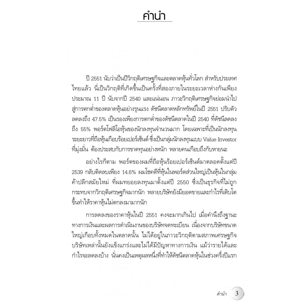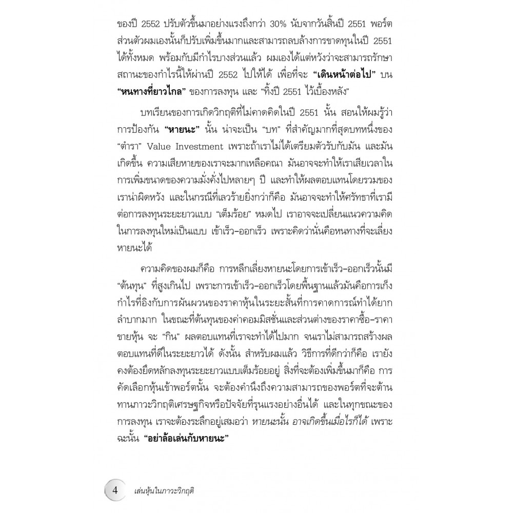 รวมสารพัดกลยุทธ์การเล่นหุ้นในยุควิกฤตเศรษฐกิจ ถ่ายทอดจากประสบการณ์ตรงของผู้เขียน ซึ่งเป็น Value Investor หมายเลขหนึ่งของเมืองไทย หนังสือเล่มนี้จะเป็นคู่มือที่ดีให้กับนักลงทุนทั้งหน้าเก่าและหน้าใหม่ ให้สามารถนำความรู้ที่ได้ ไปผสมผสานกับการวิเคราะห์ตามหลักทฤษฎี เพื่อพัฒนาทักษะการลงทุนให้ก้าวหน้า และช่วยลดความเสี่ยงในการเล่นหุ้นของคุณ