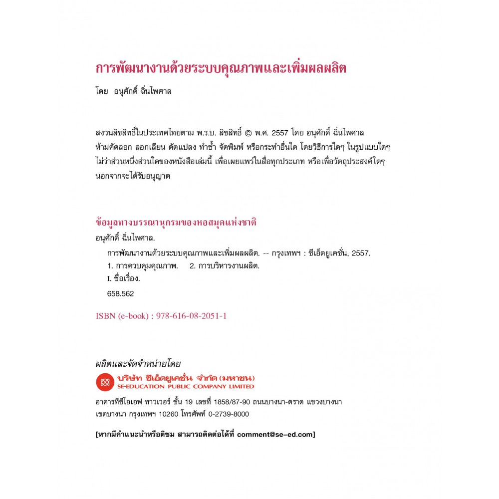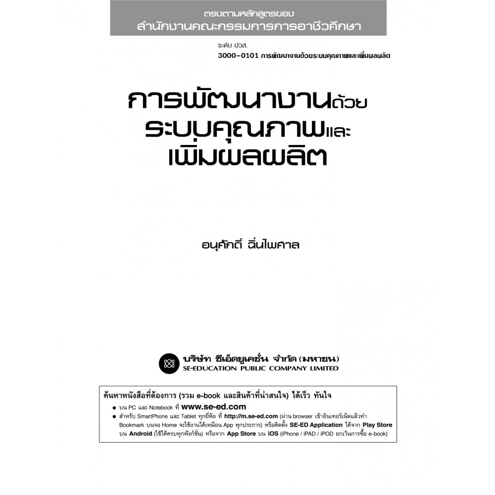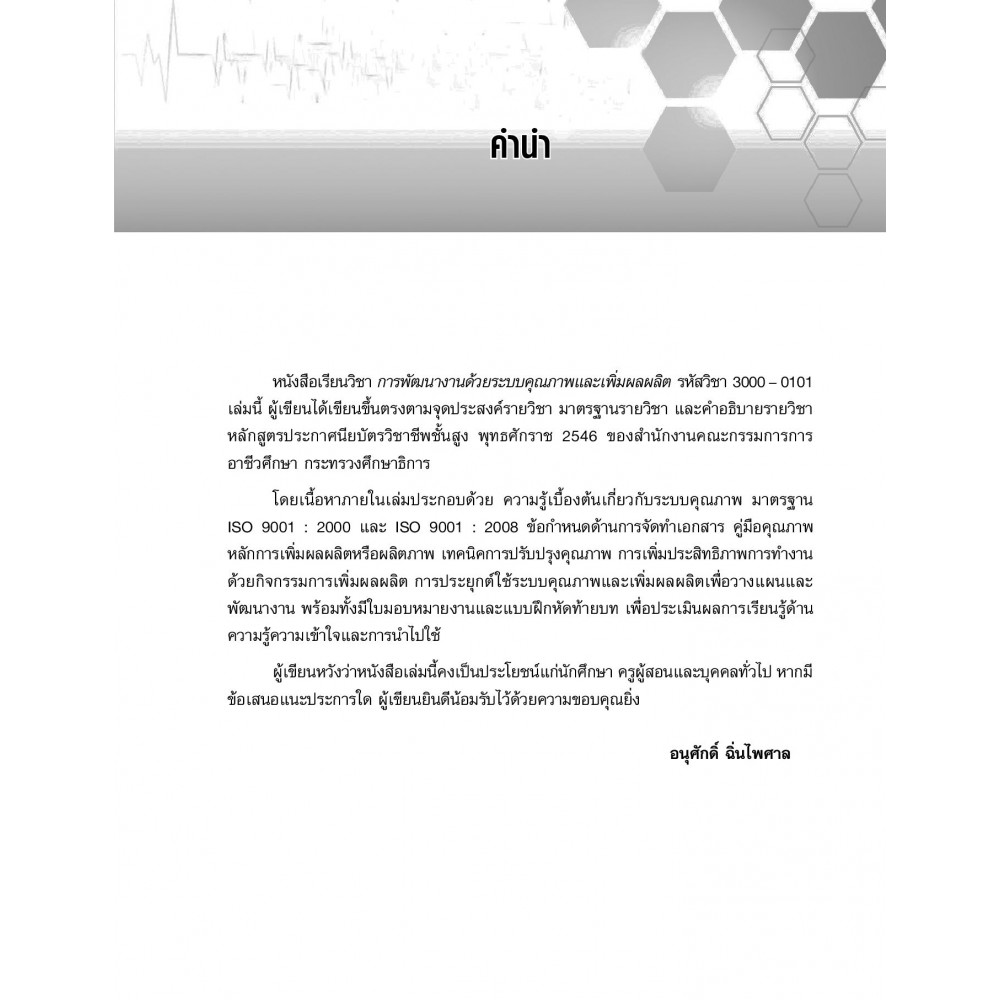 "การพัฒนางานด้วยระบบคุณภาพแลเพิ่มผลผลิต รหัสวิชา 3000-0101" เล่มนี้ เนื้อหาตรงตามจุดประสงค์รายวิชา มาตรฐานรายวิชา และคำอธิบายรายวิชา ตรงตามหลักสูตรประกาศนียบัตรวิชาชีพชั้นสูง (ปวส.) ของสำนักงานคณะกรรมการการอาชีวศึกษา กระทรวงศึกษาธิการ เนื้อหากภายในประกอบด้วยความรู้เบื้องต้นเกี่ยวกับระบบคุณภาพ ความรู้เบื้อง มาตรฐาน ISO 9001 : 2000 และ ISO 9001 : 2008 ข้อกำหนดด้านการจัดทำเอกสาร คู่มือคุณภาพ หลักการเพิ่มผลผลิตหรือผลิตภาพ เทคนิคการปรับปรุงผลิตภาพ การเพิ่มประสิทธิภาพการทำงานด้วยกิจกรรมการเพิ่มผลผลิต การประยุกต์ใช้ระบบคุณภาพและเพิ่มผลผลิตเพื่อการวางแผนและพัฒนางาน พร้อมทั้งมีใบมอบหมายงานและแบบฝึกหัดท้ายบท เพื่อประเมินผลการเรียนรู้ด้านความรู้ความเข้าใจและการนำไปใช้