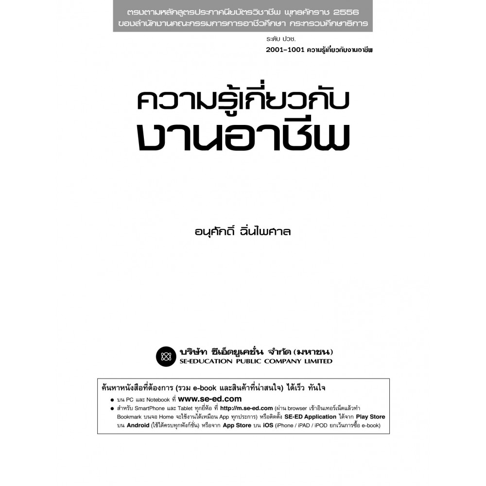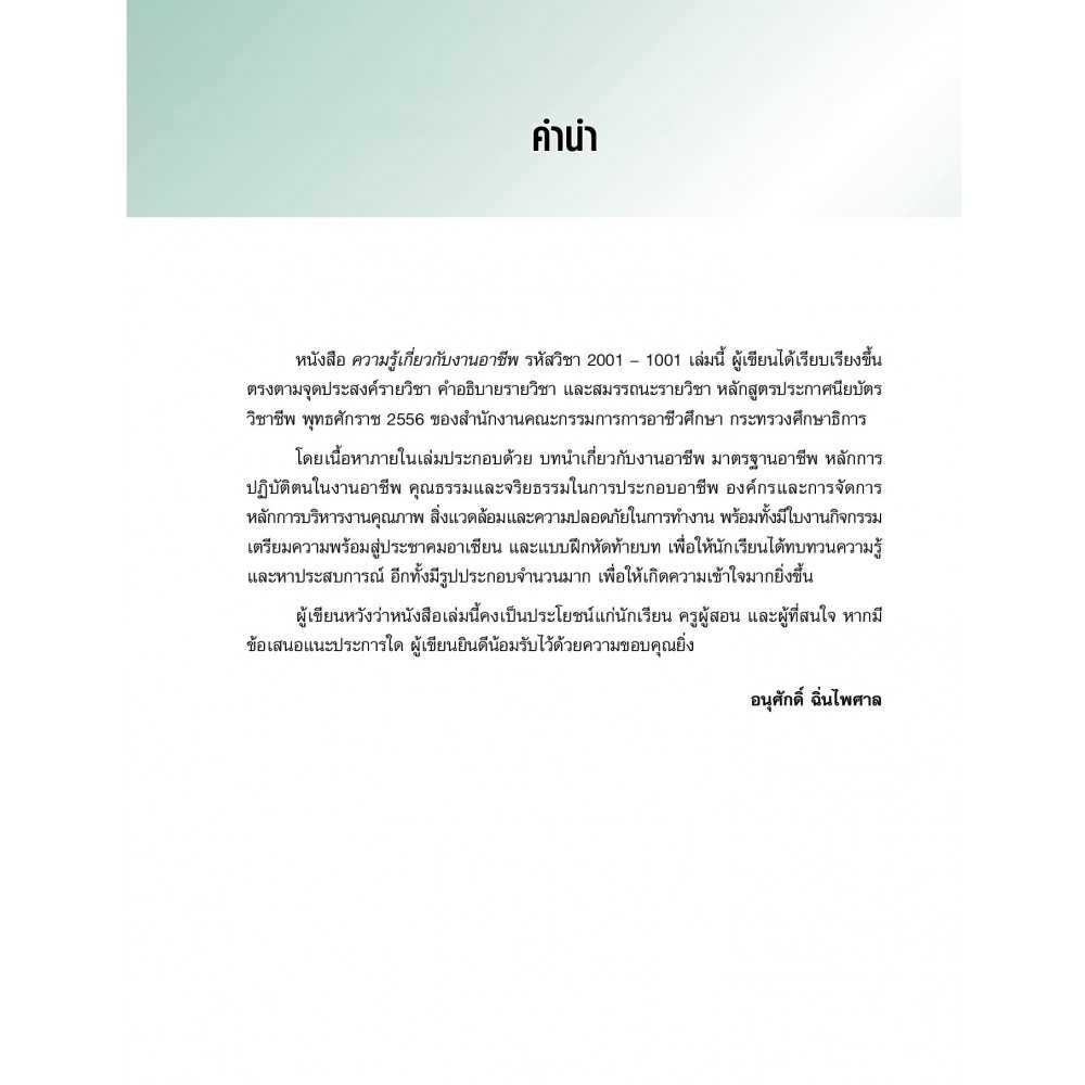 ความรู้เกี่ยวกับงานอาชีพ รหัสวิชา 2001 - 1001 เล่มนี้ ผู้เขียนได้เขียนขึ้นตรงตามจุดประสงค์รายวิชา มาตรฐานรายวิชา และคำอธิบายรายวิชา หลักสูตรประกาศนียบัตรวิชาชีพ พุทธศักราช 2556 ของสำนักงานคณะกรรมการอาชีวศึกาา กระทรวงศึกษาธิการ โดยเนื้อหาภายในเล่มประกอบด้วย บทนำเกี่ยวกับงานอาชีพ มาตรฐานอาชีพ หลักกการปฏิบัติตนในงานอาชีพ คุณธรรมและจริยธรรมในการประกอบอาชีพ องค์กรและการจัดการองค์กร หลักการบริหารงานคุณภาพ รวมทั้งเรื่องสิ่งแวดล้อมและความปลอดภัยในการทำงาน เป็นต้น พร้อมด้วยใบมอบหมายงานและแบบฝึกหัดท้ายบท เพื่อประเมินผลการเรียนรู้ด้านความรู้ความเข้าใจและการนำไปใช้