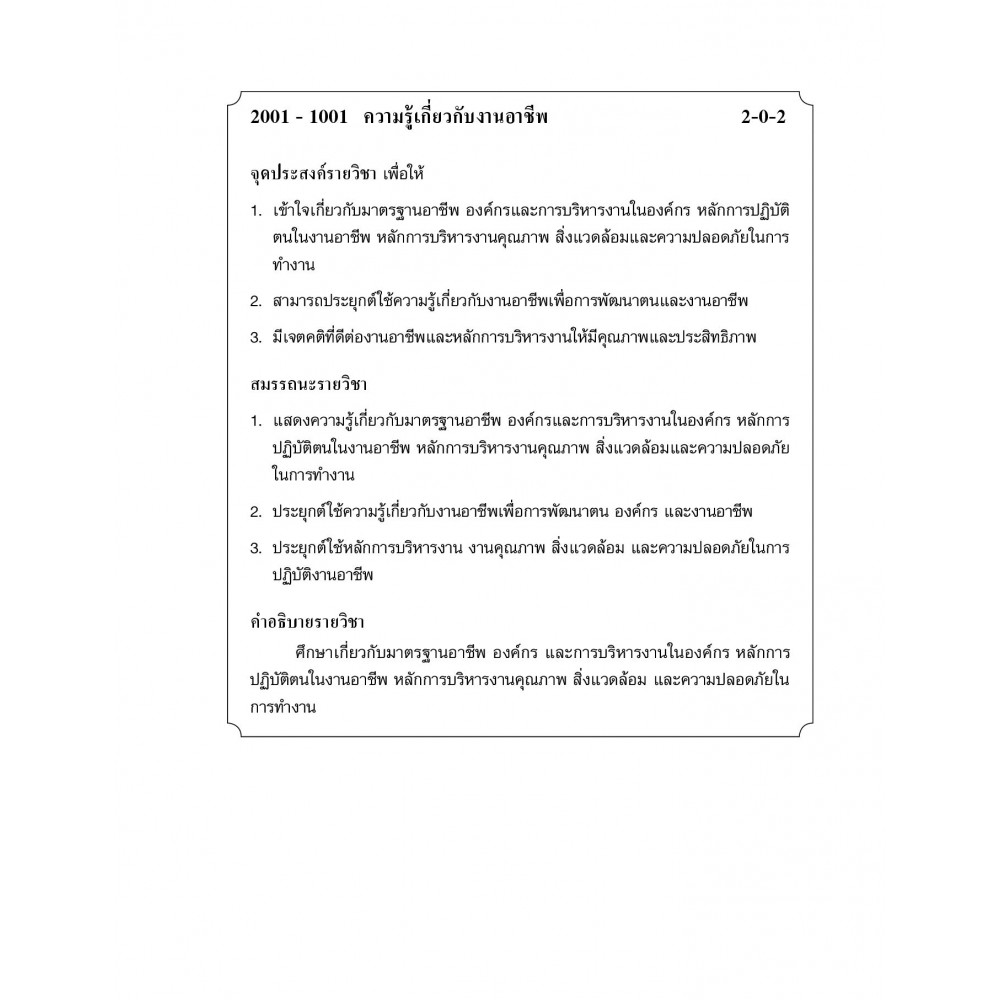 ภายในเล่มประกอบด้วยบทนำเกี่ยวกับงานอาชีพ มาตรฐานอาชีพ หลักการปฏิบัติตนในงานอาชีพ คุณธรรมและจริยธรรมในการประกอบอาชีพ องค์กรและการจัดองค์กร หลักการบริหารงานคุณภาพ รวมถึงสิ่งแวดล้อม ความปลอดภัยในการทำงาน