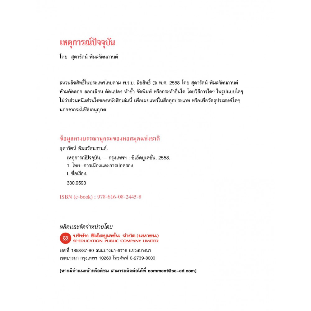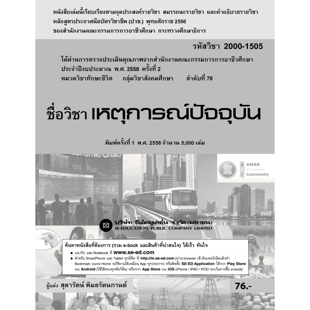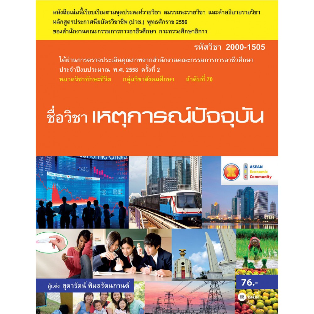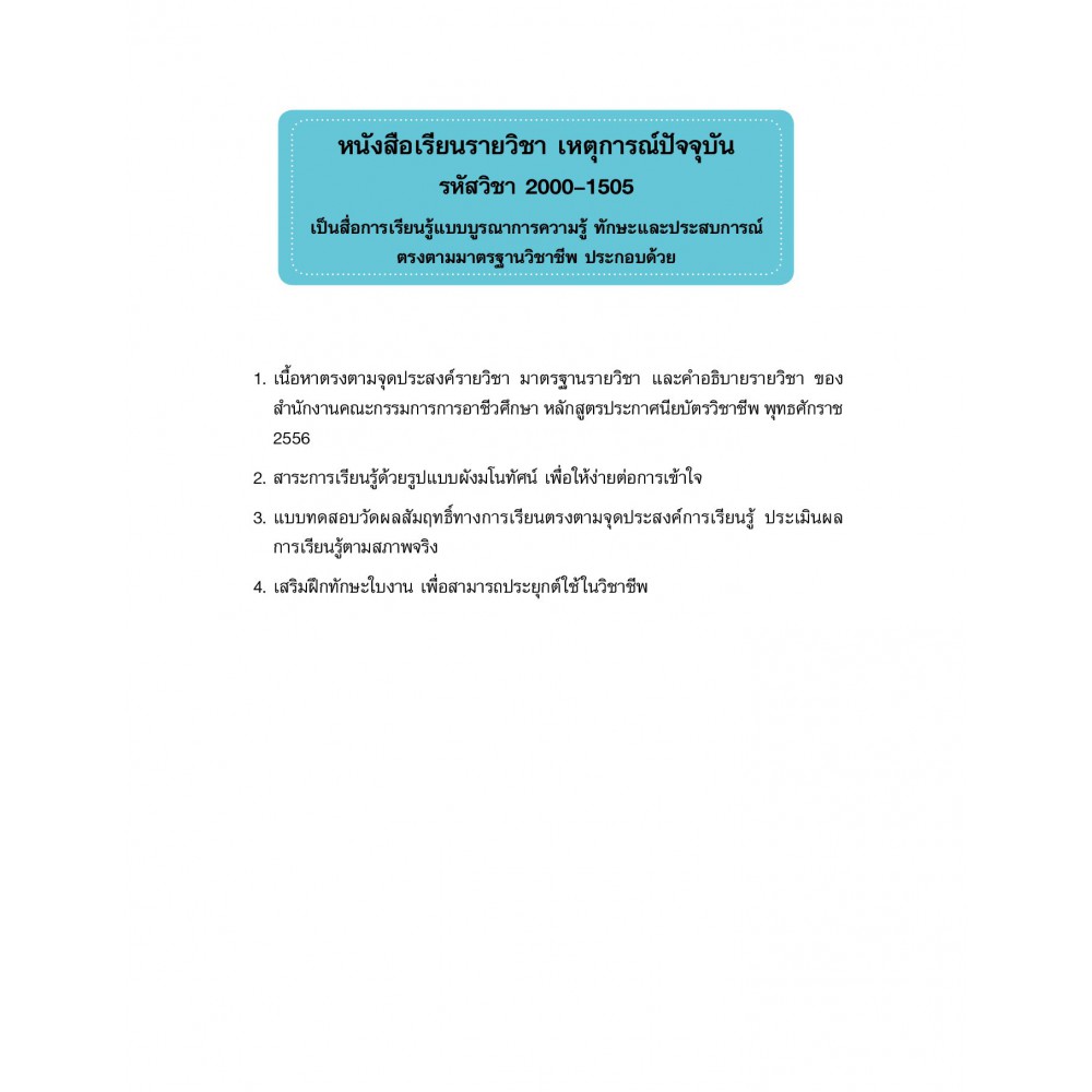 "เหตุการณ์ปัจจุบัน (รหัสวิชา 2000-1505)" หมวดวิชาทักษะชีวิตเล่มนี้ เรียบเรียงขึ้นเพื่อใช้ในการเรียนการสอนระดับประกาศนียบัตรวิชาชีพ (ปวช.) พ.ศ. 2556 กระทรวงศึกษาธิการ เนื้อหาประกอบด้วย สถานการณ์ของระบบเศรษฐกิจในปัจจุบัน สถานการณ์โลกในปัจจุบันและโลกยุคโลกาภิวัตน์ ปัญหาวิกฤตเศรษฐกิจของไทย การเมืองการปกครองของไทยและวิกฤตการเมืองไทย เป็นต้น ซึ่งทุกบทเรียนมีการเสริมสร้างการเรียนรู้ มีแบบประเมินผลการเรียนรู้ และใบงาน เพื่อทบทวนความรู้ความเข้าใจและฝึกทักษะในการปฏิบัติ รวมทั้งได้นำหลักการเตรียมความพร้อมในการเข้าสู่ประชาคมอาเซียนมาบูรณาการในเนื้อหาการเรียน เพื่อปลูกฝังให้ผู้เรียนได้พัฒนาตนเองบนพื้นฐานความรู้ด้านอาเซียน และสามารถนำไปประยุกต์ใช้ในการดำเนินชีวิตได้อย่างมีประสิทธิภาพ