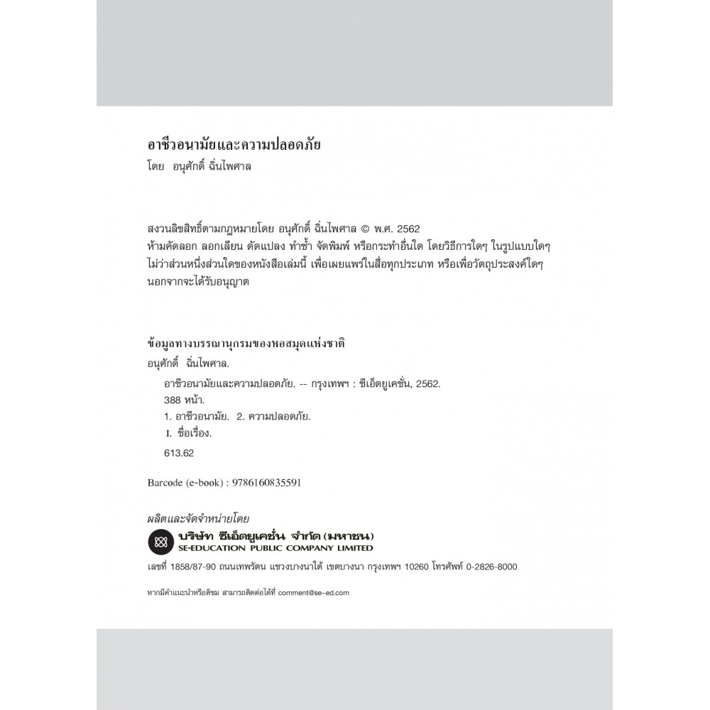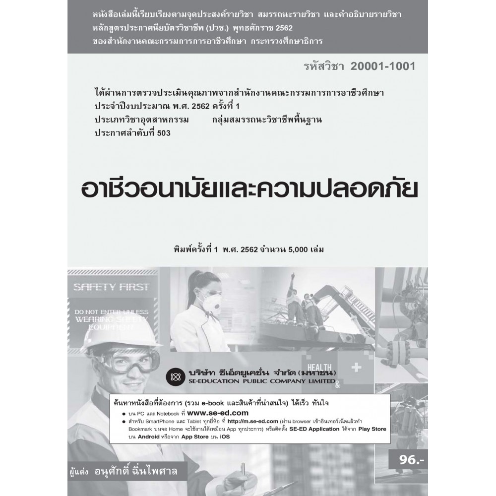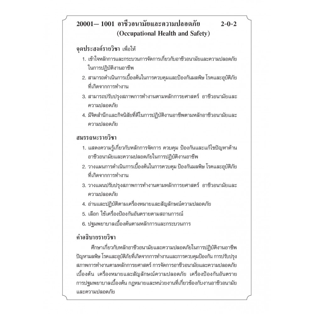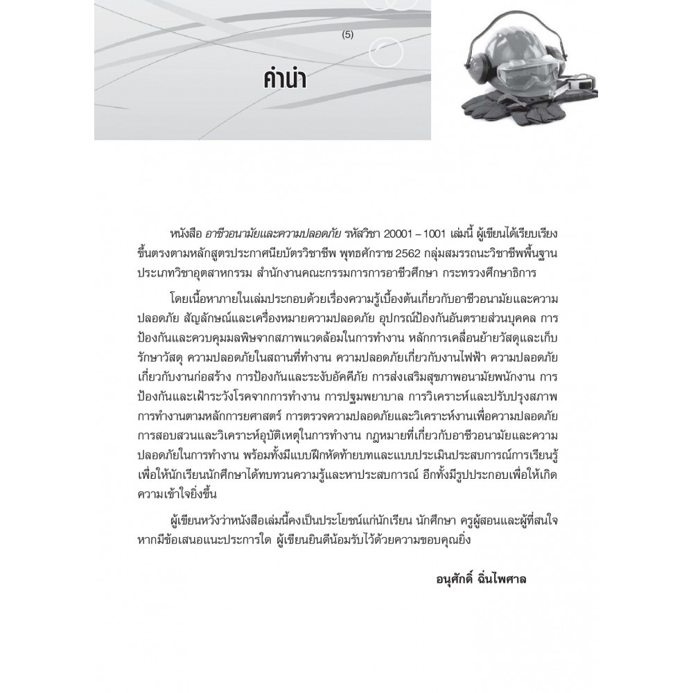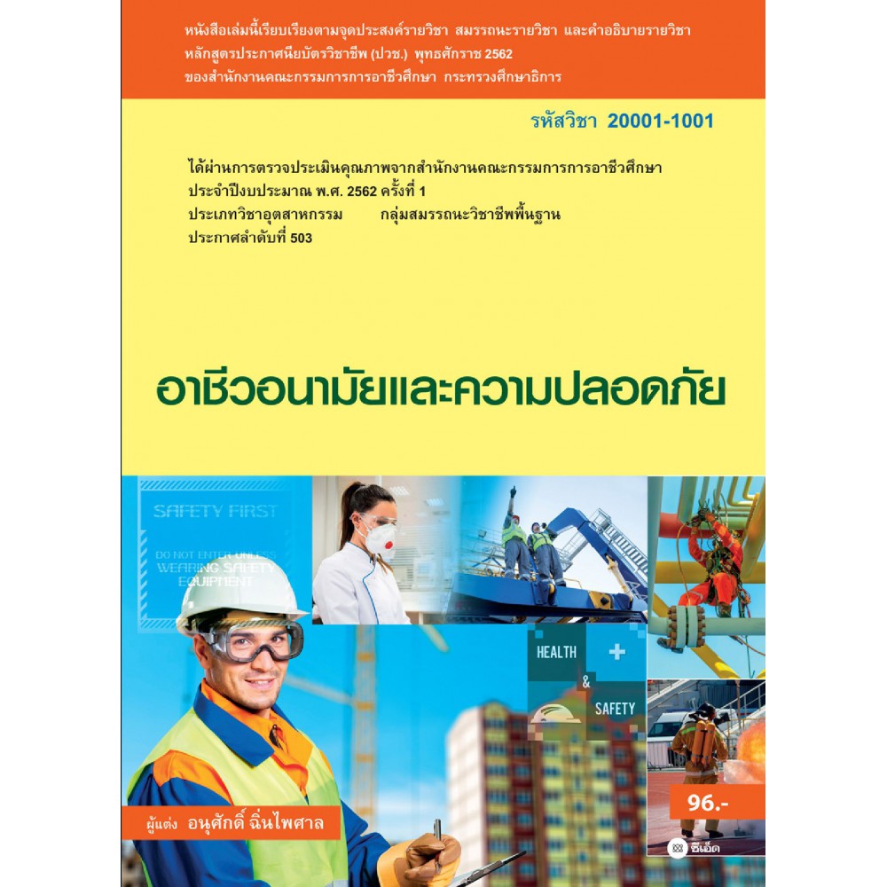 "อาชีวอนามัยและความปลอดภัย รหัสวิชา 20001-1001" เล่มนี้ มีเนื้อหาประกอบด้วย หลักอาชีวอนามัยและความปลอดภัยในการปฏิบัติงานอาชีพ ปัญหามลพิษ โรคและอุบัติภัย ที่เกิดจากการทำงานและการควบคุมป้องกัน การปรับปรุงสภาพการทำงานตามหลักการยศาสตร์ การจัดการอาชีวอนามัยและความปลอดภัยเบื้องต้น เครื่องหมายและสัญลักษณ์ความปลอดภัย เครื่องป้องกันอันตราย การปฐมพยาบาลเบื้องต้น กฎหมายและหน่วยงานที่เกี่ยวข้องกับงานอาชีวอนามัยและความปลอดภัย เหมาะสำหรับใช้ประกอบการเรียนการสอนรายวิชา อาชีวอนามัยและความปลอดภัย สมรรถนะวิชาชีพพื้นฐาน วิชาชีพพื้นฐาน ตรงตามหลักสูตรประกาศนียบัตรวิชาชีพ พุทธศักราช 2562 ของสำนักงานคณะกรรมการการอาชีวศึกษา กระทรวงศึกษาธิการ สารบัญ บทที่ 1 ความรู้เบื้องต้นเกี่ยวกับอาชีวอนามัยและความปลอดภัยในการทำงาน บทที่ 2 สัญลักษณ์และเครื่องหมายความปลอดภัย บทที่ 3 อุปกรณ์ป้องกันภัยส่วนบุคคล บทที่ 4 การป้องกันและการควบคุมมลพิษจากสภาพแวดล้อมในการทำงาน บทที่ 5 หลักการเคลื่อนย้ายวัสดุและการเก็บรักษา บทที่ 6 ความปลอดภัยในสถานที่ทำงาน บทที่ 7 ความปลอดภัยเกี่ยวกับงานไฟฟ้า บทที่ 8 ความปลอดภัยเกี่ยวกับงานก่อสร้าง บทที่ 9 การป้องกันและระงับอัคคีภัย บทที่ 10 การส่งเสริมสุขภาพอนามัยและการป้องกันโรคจากการทำงาน บทที่ 11 การปฐมพยาบาล บทที่ 12 การวิเคราะห์และปรับปรุงการทำงานตามหลักการยศาสตร์ บทที่ 13 การตรวจความปลอดภัยและการวิเคราะห์งานเพื่อความปลอดภัย บทที่ 14 การสอบสวนและการวิเคราะห์อุบัติเหตุในการทำงาน บทที่ 15 กฏหมายเกี่ยวกับอาชีวอนามัยและความปลอดภัย