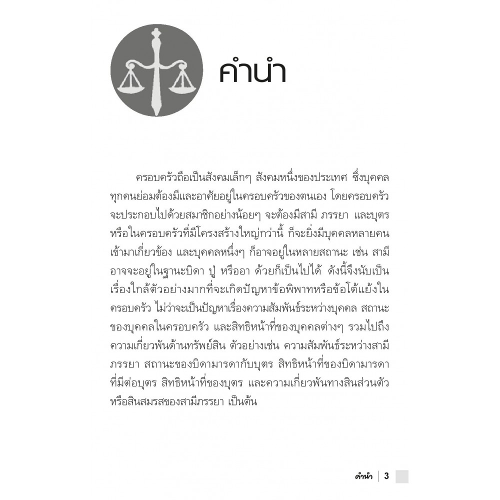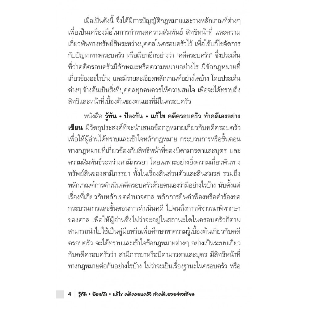 นำเสนอข้อกฎหมายเกี่ยวกับคดีครอบครัวที่สำคัญ เพื่อให้ผู้อ่านได้ทราบและเข้าใจหลักกฎหมาย กระบวนการ หรือขั้นตอนทางกฎหมายที่เกี่ยวข้องกับสิทธิหน้าที่ของบิดามารดาและบุตร ความสัมพันธ์ระหว่างสามีภรรยา โดยเฉพาะความเกี่ยวพันทางทรัพย์สินของสามีภรรยา โดยเฉพาะอย่างยิ่ง ความเกี่ยวพันทางทรัพย์สินของสามีภรรยา ทั้งในเรื่องสินส่วนตัวและสินสมรส