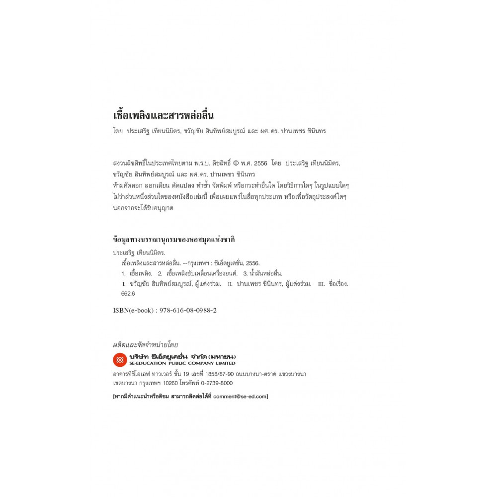 "เชื้อเพลิงและสารหล่อลื่น" เล่มนี้ ได้รวบรวมและอธิบายถึงคุณสมบัติของเชื้อเพลิงนำมันหล่อลื่น และสารหล่อลื่นชนิดต่างๆ ที่เหมาะสมกับงานแต่ละประเภท รวมทั้งกล่าวถึงความสำคัญของสารเพิ่มคุณภาพต่างๆ พร้อมทั้งเหตุผลที่ใช้ เพื่อที่จะได้นำไปประกอบการตัดสินใจต่อการพิจารณาเลือกใช้ได้อย่างถูกต้อง ทั้งยังได้รวบรวมตารางและแผนภูมิที่แสดงถึงคุณสมบัติ การเปรียบเทียบและการเปลี่ยนแปลงหน่วยที่ใช้วัดค่าต่างๆ ที่มีความสำคัญต่อการศึกษาในเรื่องของเชื้อเพลิงและสารหล่อลื่นที่ใช้เป็นมาตรฐานตามที่สถาบันต่างๆ รับรอง