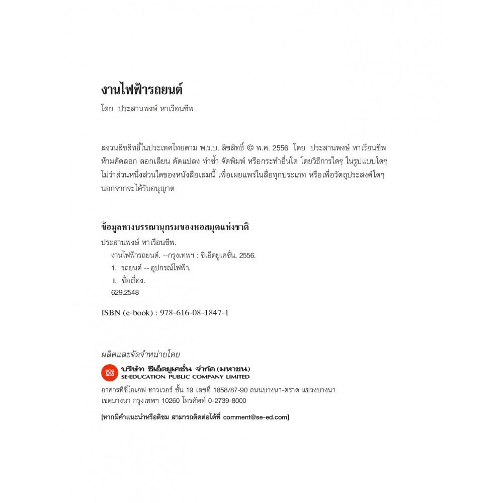 "งานไฟฟ้ารถยนต์" เล่มนี้ มีเนื้อหาครอบคลุมเครื่องมือวัดทางไฟฟ้า หลักการไฟฟ้าเบื้องต้น แบตเตอรี่ ระบบสตาร์ต ระบบจุดระเบิด ระบบประจุไฟฟ้า ระบบไฟแสงสว่างและสัญญาณไฟเตือน ระบบปัดน้ำฝนและระบบฉีดน้ำล้างกระจก และเกจวัดบนแผงหน้าปัด นอกจากนี้ยังได้บรรจุเนื้อหาในภาคทฤษฎีไว้ตรงตามหลักสูตรของนักศึกษาระดับ ปวช. สาขาช่างยนต์ และบุคคลทั่วไปด้วย