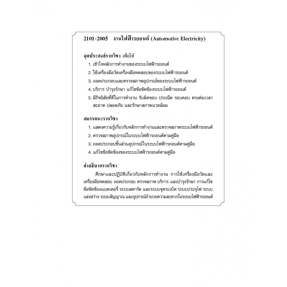 มีเนื้อหาครอบคลุมเครื่องมือวัดทางไฟฟ้า หลักการไฟฟ้าเบื้องต้น แบตเตอรี่ ระบบสตาร์ต ระบบจุดระเบิด ระบบประจุไฟฟ้า ระบบไฟแสงสว่างและสัญญาณไฟเตือน ระบบปัดน้ำฝนและระบบฉีดน้ำล้างกระจก และเกจวัดบนแผงหน้าปัด