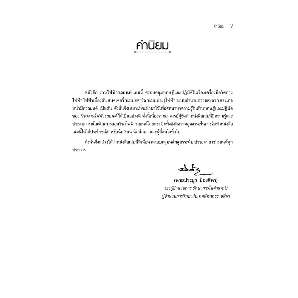 หนังสือ "งานไฟฟ้ารถยนต์" เล่มนี้ ครอบคลุมทฤษฎีและปฏิบัติในเรื่องเครื่องมือวัดทางไฟฟ้า ไฟฟ้าเบื้องต้น แบตเตอรี่ ระบบสตาร์ต ระบบประจุไฟฟ้า ระบบอำนวยความสะดวก และเกจหน้าปัดรถยนต์ เป็นต้น ดังนั้นจึงเหมาะที่จะนำมาใช้เพื่อศึกษาหาความรู้ในด้านทฤษฎีและปฏิบัติของ "วิชางานไฟฟ้ารถยนต์" ได้เป็นอย่างดี ทั้งนี้เนื่องจากอาจารย์ผู้จัดทำหนังสือเล่มนี้มีความรู้และประสบการณ์ในด้านการสอนวิชางานไฟฟ้ารถยนต์โดยตรง อีกทั้งยังมีความอุตสาหะในการจัดทำหนังสือเล่มนี้ให้ได้ประโยชน์สำหรับนักเรียน นักศึกษา และผู้ที่สนใจทั่วไป