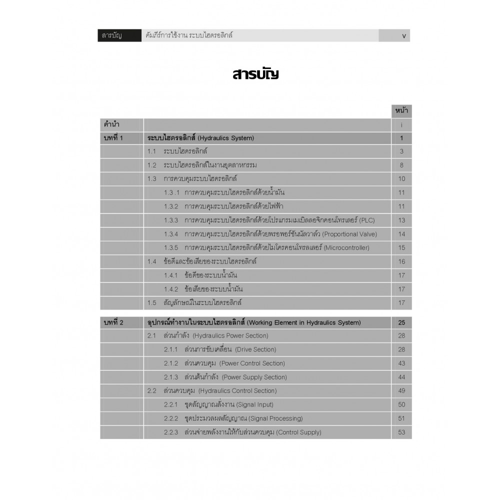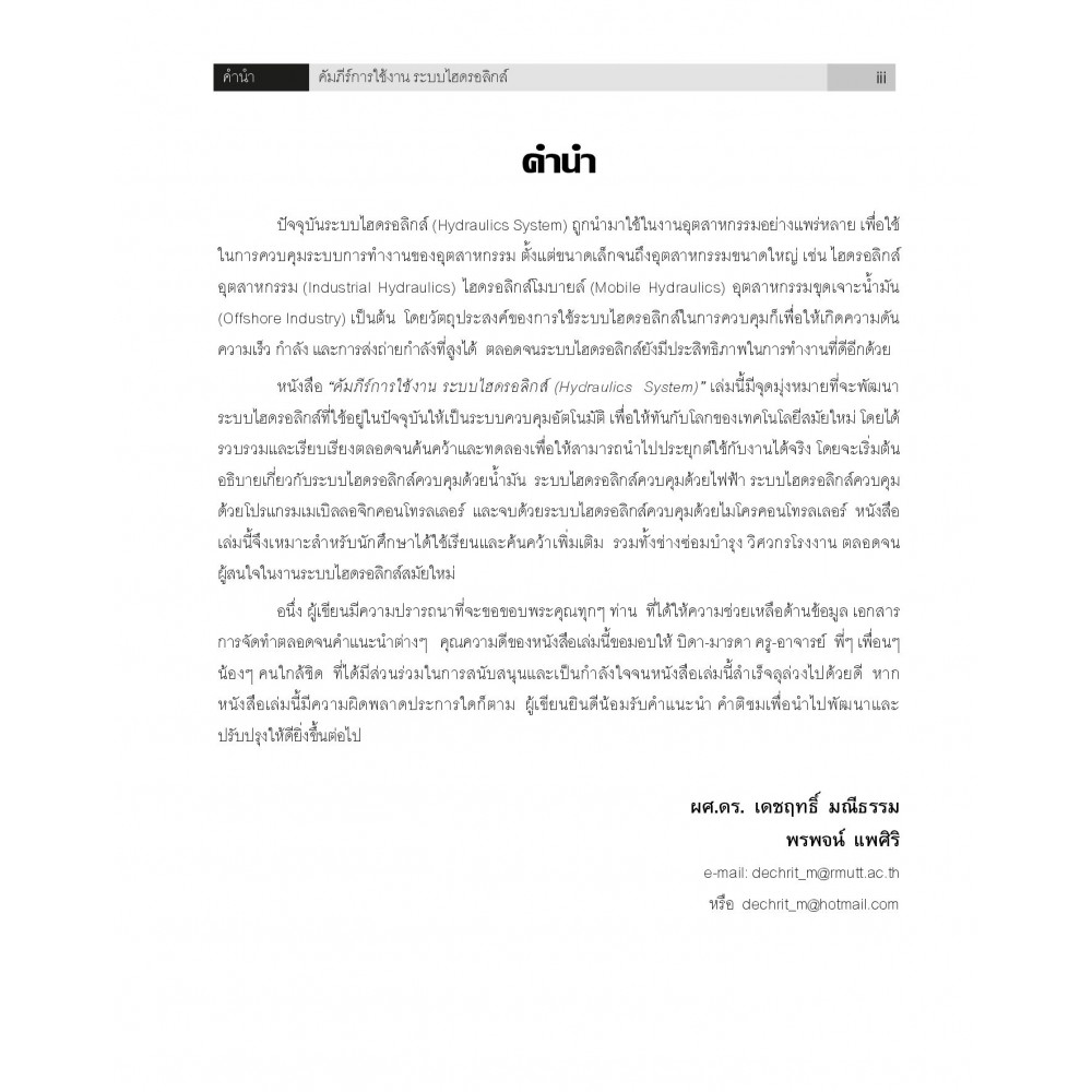 กล่าวถึงระบบไฮดรอลิกส์ (Hydraulic System) ที่ถูกนำมาใช้ในงานอุตสาหกรรมกันอย่างแพร่หลาย เพื่อใช้ในการควบคุมระบบการทำงานของอุตสาหกรรม ตั้งแต่ขนาดเล็กจนถึงขนาดใหญ่ เช่น ไฮดรอลิกส์อุตสาหกรรม (Industrial Hydraulic) ไฮดรอลิกส์โมบาย (Mobile Hydraulic) อุตสาหกรรมขุดเจาะน้ำมัน (Offshore Industry) เพื่อให้ใช้ระบบไฮดรอลิกส์ในการควบคุมให้เกิดความดัน ความเร็ว กำลัง และการส่งถ่ายกำลังที่สูงได้ อีกทั้งระบบไฮดรอลิกส์ยังมีประสิทธิภาพในการทำงานที่ดีด้วย ซึ่งจะเริ่มต้นอธิบายเกี่ยวกับระบบไฮดรอลิกส์ควบคุมด้วยน้ำมัน ระบบไฮดรอลิกส์ควบคุมด้วยไฟฟ้า ระบบไฮดรอลิกส์ควบคุมด้วยโปรแกรมเมเบิล ลอจิก คอนโทรลเลอร์ หรือ PLC และระบบไฮดรอลิกส์ควบคุมด้วยไมโครคอนโทรลเลอร์ และตัวอย่างโครงงานการสร้างชุดเครื่องอัดไฮดรอลิกส์ (ขนาดเล็ก) ที่ควบคุมด้วยไมโครคอนโทรลเลอร์ เพื่อนำไปใช้เป็นกรณีศึกษาอีกด้วย ในเล่มอธิบายเนื้อหาอย่างละเอียด เข้าใจง่าย สามารถศึกษาได้ด้วยตนเอง