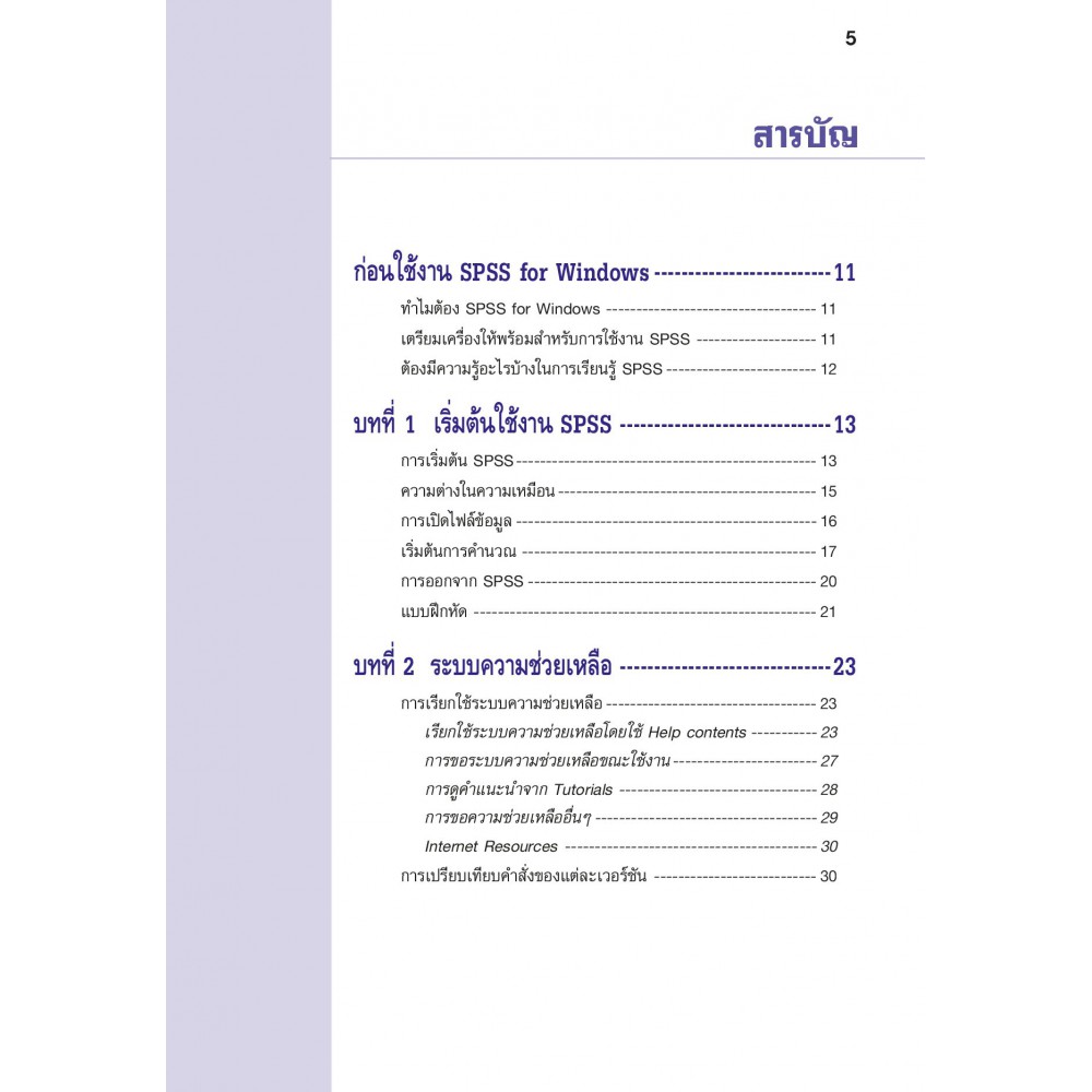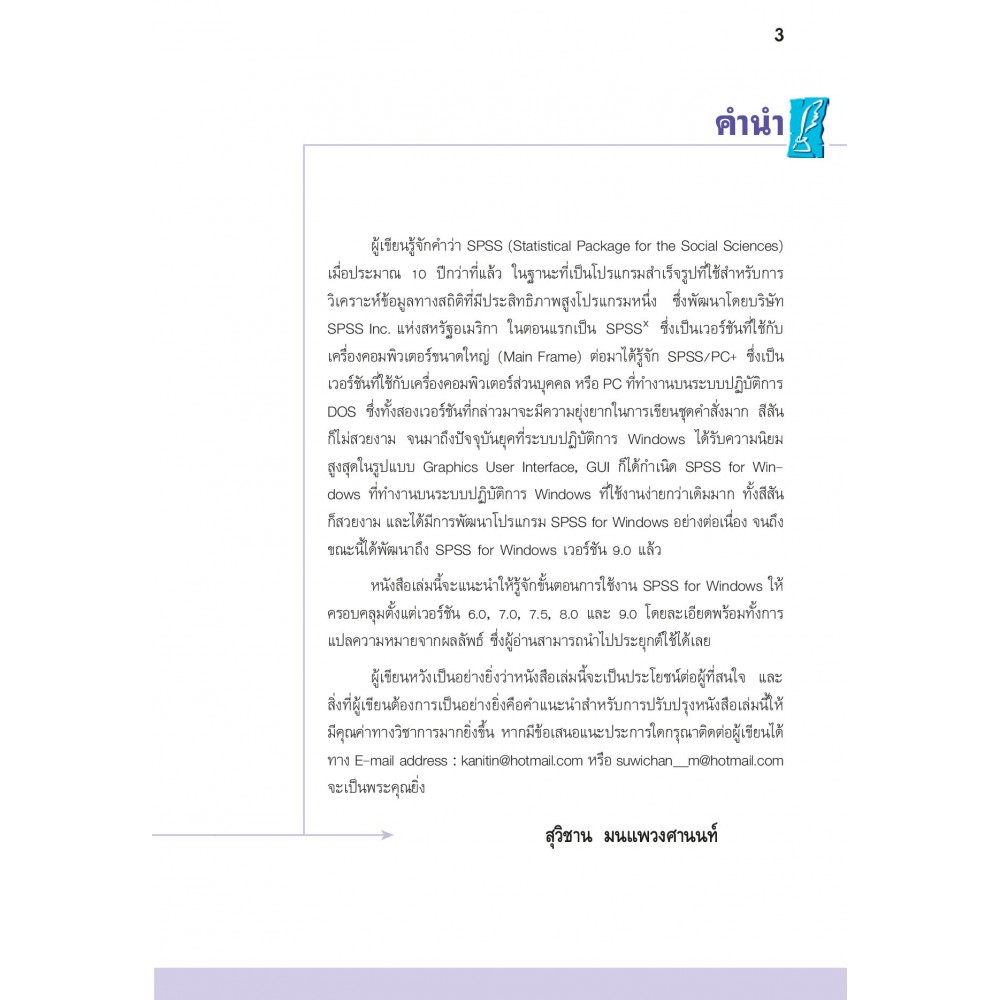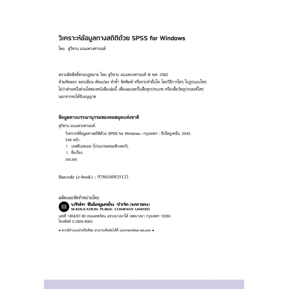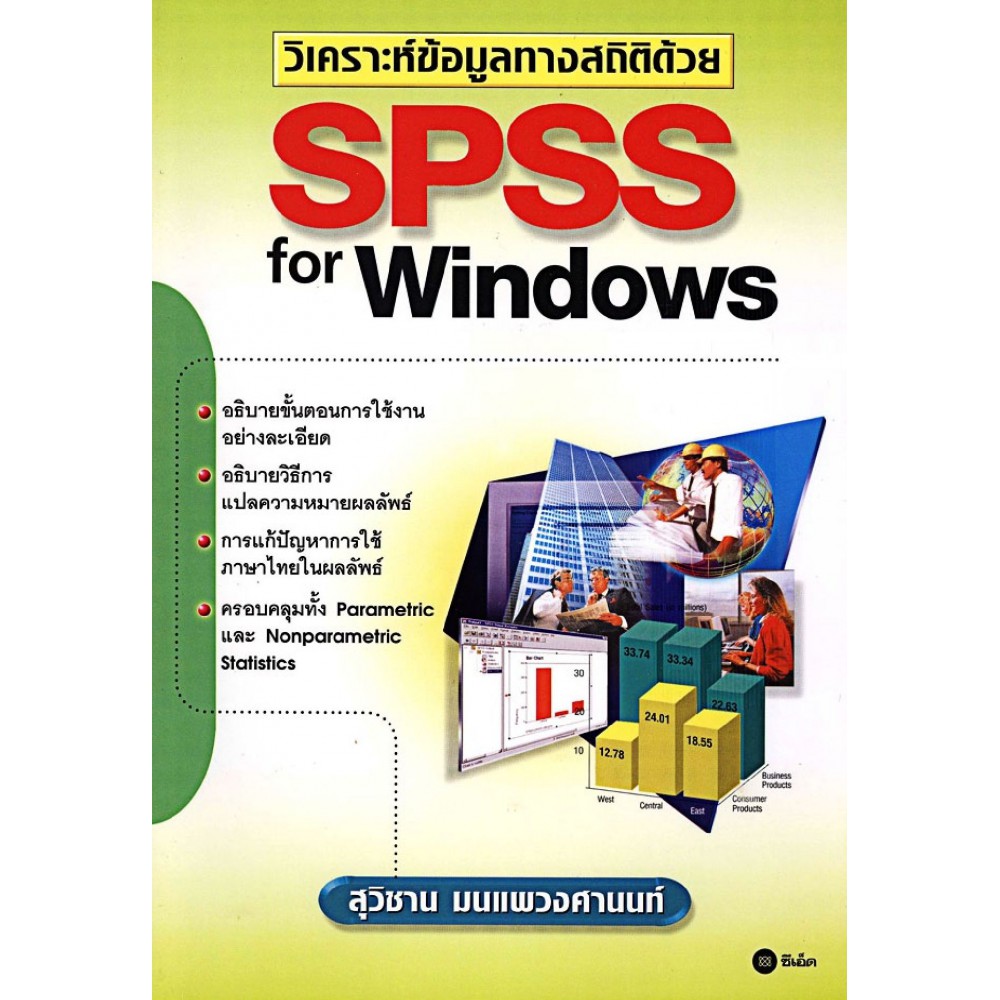 SPSS (Statistical Packages for the Social Science) เป็นซอฟต์แวร์สำหรับการวิเคราะห์ข้อมูลทางสถิติที่ได้รับความนิยมอย่างสูง มีการนำไปใช้ในทุกสาขา เช่น ด้านการศึกษา ด้านธุรกิจ ด้านสังคมศาสตร์ และด้านวิทยาศาสตร์ เป็นต้น หนังสือวิเคราะห์ข้อมูลทางสถิติด้วย SPSS for Windows เล่มนี้ ประกอบไปด้วยเนื้อหาต่างๆ ที่จำเป็นสำหรับการใช้งานตั้งแต่พื้นฐานจนถึงการใช้งานได้จริง ครอบคลุมทั้ง Parametric และ Nonparametric Statistics มีภาพตัวอย่างแสดงทุกขั้นตอนของการใช้งานจริง อธิบายการแปลความหมายของผลลัพธ์ ตลอดทั้งอธิบายถึงวิธีการจัดการกับผลลัพธ์ที่เข้าใจได้ง่าย การกำหนดรูปแบบผลลัพธ์ด้วย Template, Script นอกจากนี้ยังอธิบายเปรียบเทียบคำสั่งของ SPSS แต่ละรุ่นเพื่อให้สามารถนำไประยุกต์ใช้กับ SPSS ทุกรุ่นได้อีกด้วย จึงเหมาะสำหรับนักศึกษา นักวิจัยหรือผู้ที่ต้องการวิเคราะห์ข้อมูลทางสถิติด้วยคอมพิวเตอร์