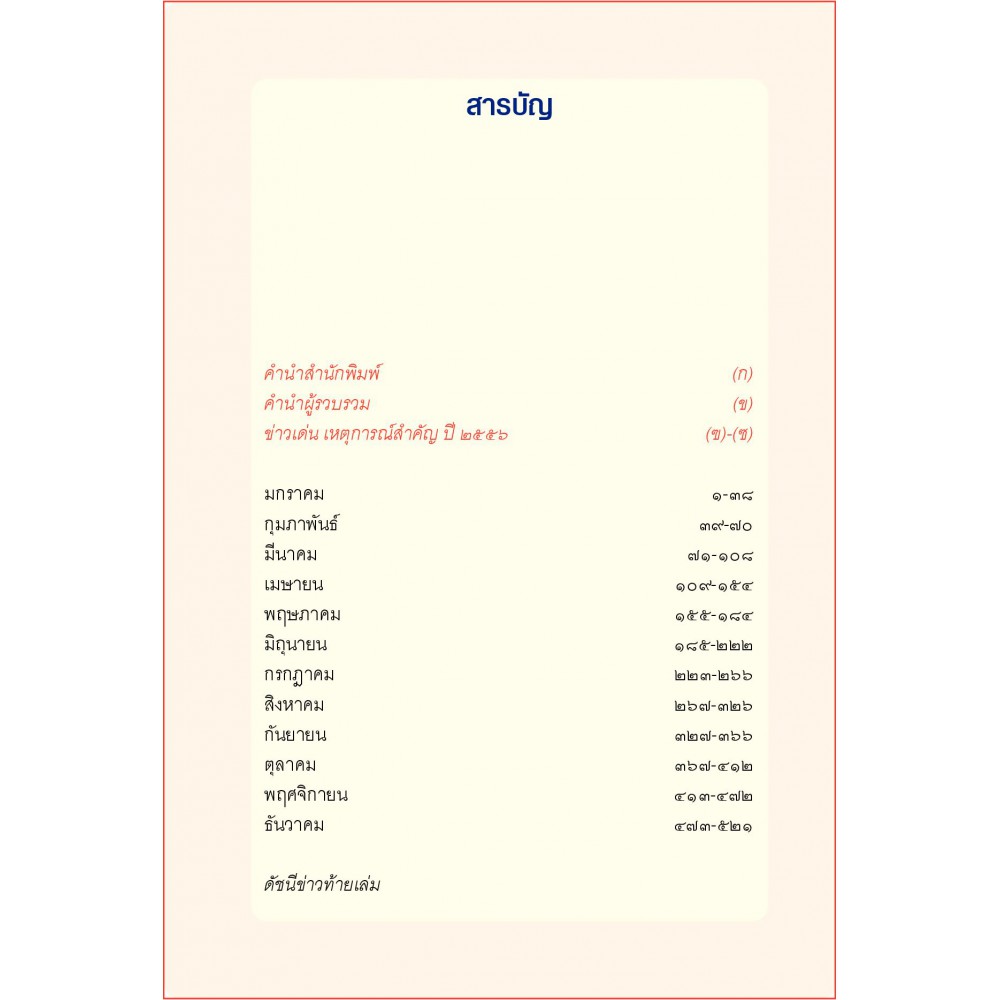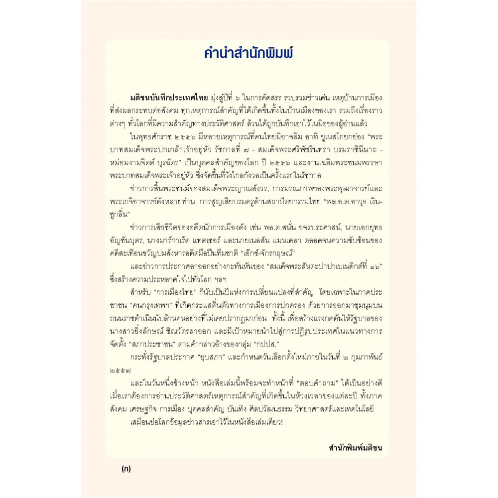 "มติชนบันทึกประเทศไทย" มุ่งสู่ปีที่ 6 ในการคัดสรร รวบรวมข่าวเด่น เหตุบ้านการเมืองที่ส่งผลกระทบต่อสังคม ทุกเหตุการณ์สำคัญที่ได้เกิดขึ้นทั้งในบ้านเมืองของเรา รวมถึงเรื่องราวต่างๆ ทั่วโลกที่มีความสำคัญทางประวัติศาสตร์ ล้วนได้ถูกบันทึกเอาไว้ในมือของผู้อ่านแล้ว ในพุทธศักราช 2556 มีหลายเหตุการณ์ที่คนไทยมิอาจลืม อาทิ ยูเนสโกยกย่อง "พระบาทสมเด็จพระปกเกล้าเจ้าอยู่หัว รัชกาลที่ 7 สมเด็จพระศรีพัชรินทรา บรมราชินีนาถ หม่อมงามจิตต์ บุรฉัตร" เป็นบุคคลสำคัญของโลก ปี 2556 และงานเฉลิมพระชนมพรรษาพระบาทสมเด็จพระเจ้าอยู่หัว ซึ่งจัดขึ้นที่วังไกลกังวลเป็นครั้งแรกในรัชกาล ข่าวการสิ้นพระชนม์ของสมเด็จพระญาณสังวรฯ การมรณภาพของพระพุฒาจารย์และพระเกจิอาจารย์ดังหลายท่าน การสูญเสียบรมครูด้านสถาปัตยกรรมไทย "พล.อ.ต.อาวุธ เงินชูกลิ่น" กระทั่งรัฐบาลประกาศ "ยุบสภา" และกำหนดวันเลือกตั้งใหม่ภายในวันที่ 2 กุมภาพันธ์ 2557